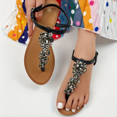 Rhinestone T-strap Flip Flop Sandals for Women - Open Toe Buckle Strap Shoes