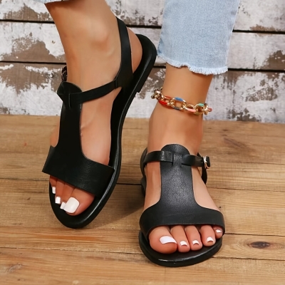 Black T-Strap Sandals: Rome Style, Ankle Buckle, Non-Slip