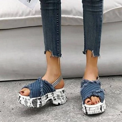 Women's Denim Alphabet Open Toe Buckle Strap Creepers Platform Sandals