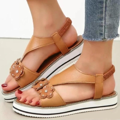 Women Casual Comfy Pu Flower Adornment Rhinestone Elastic Band Flat Sandals