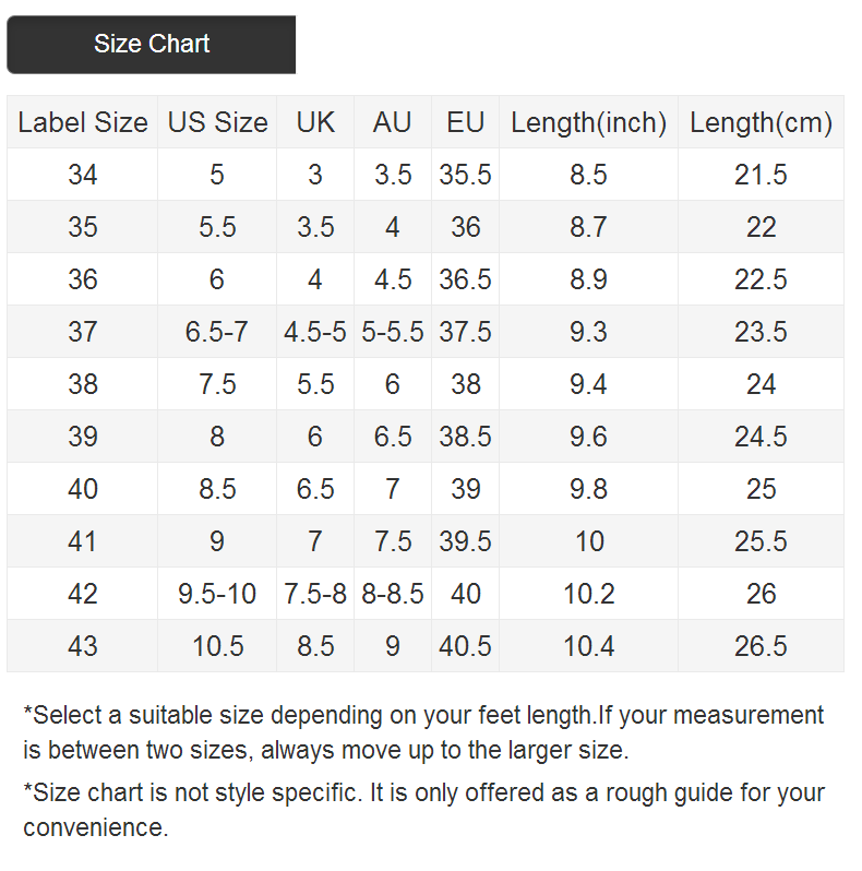 Length (inch):35:8.9, 36:9.1, 37:9.3, 38:9.4, 39:9.6, 40:9.8, 41:10, 42:10.2, 43:10.4