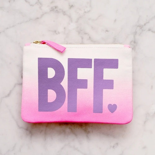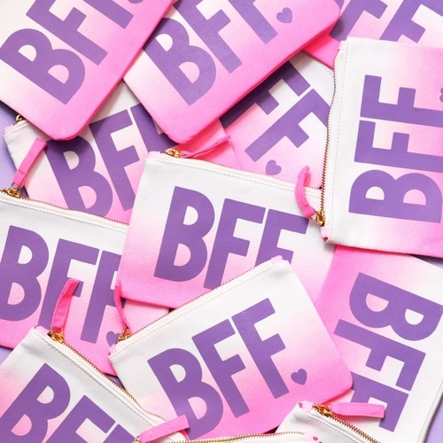 The 'BFF' design has been printed in purple on a white canvas and hot pink ombré zip pouch.