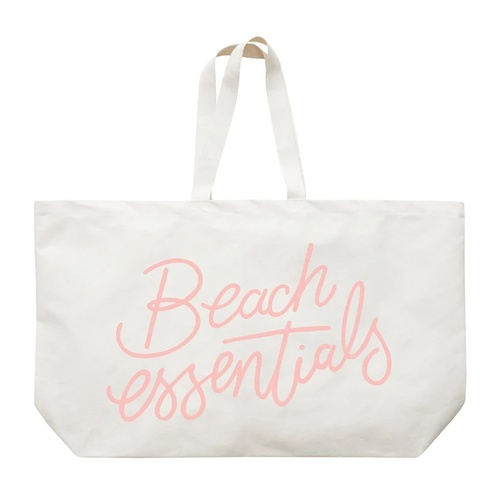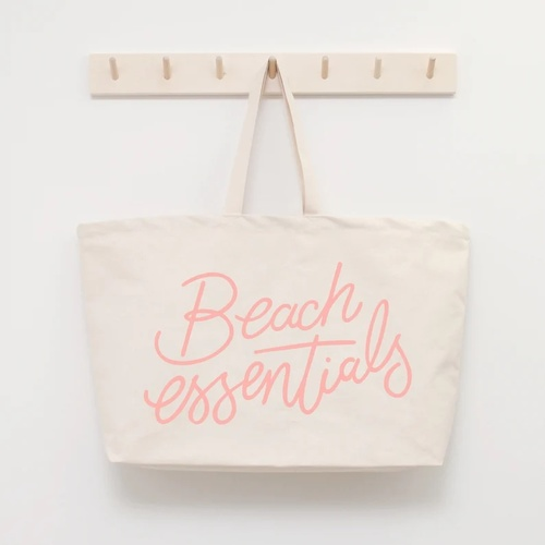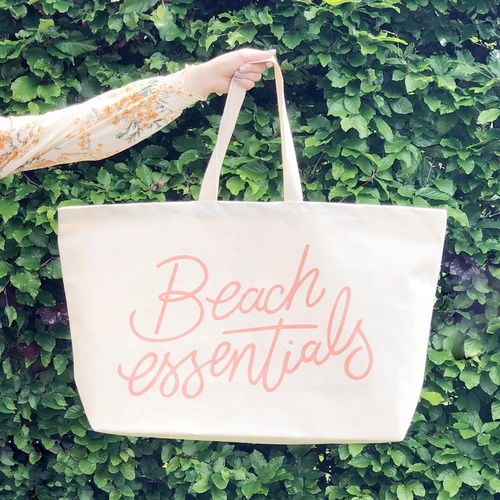 The hand lettered 'Beach Essentials' design has been printed in peach on sturdy natural canvas.
