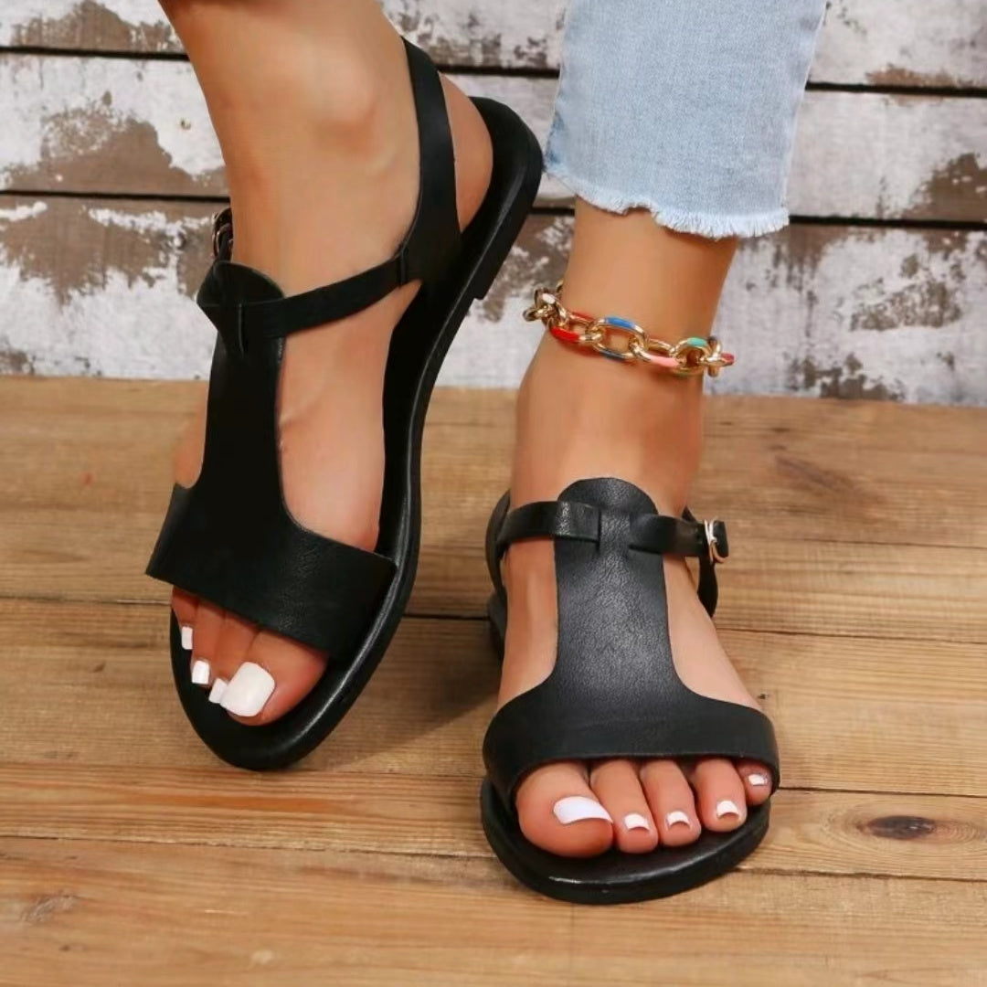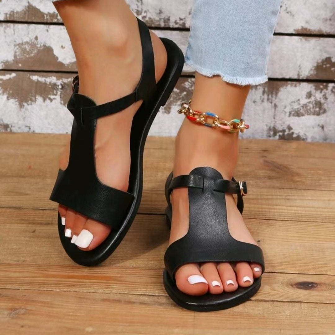 Black T-Strap Sandals: Rome Style, Ankle Buckle, Non-Slip