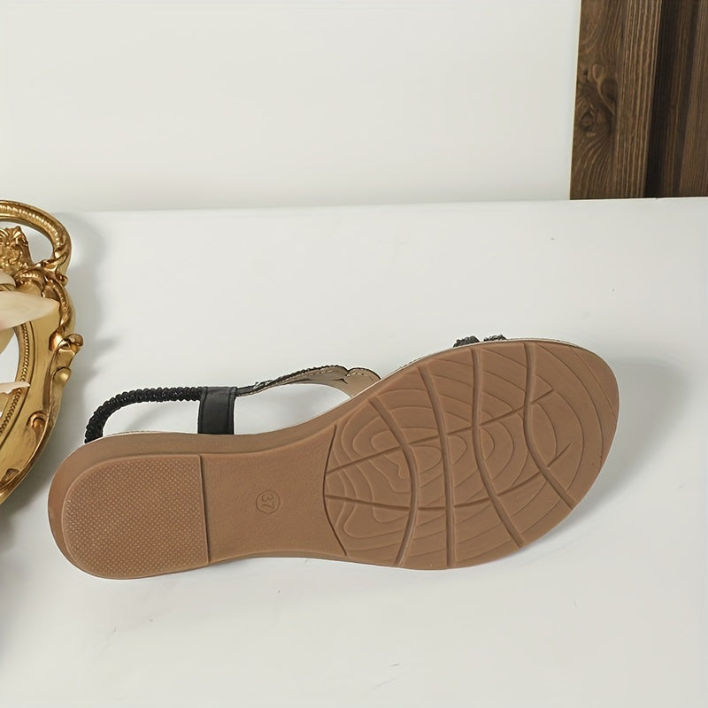 Boho Floral Rhinestone Sandals: Open Toe, Elastic Strap, Casual Beach Style