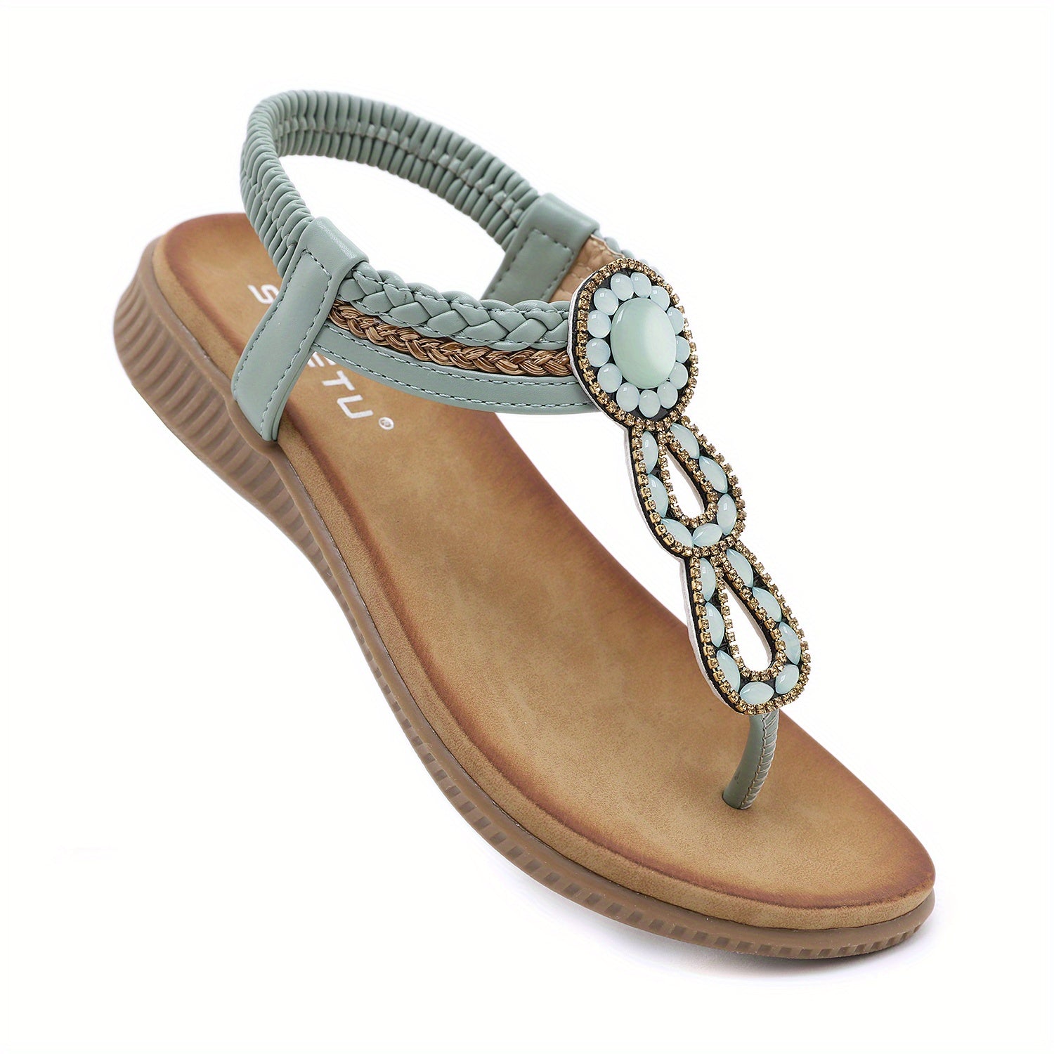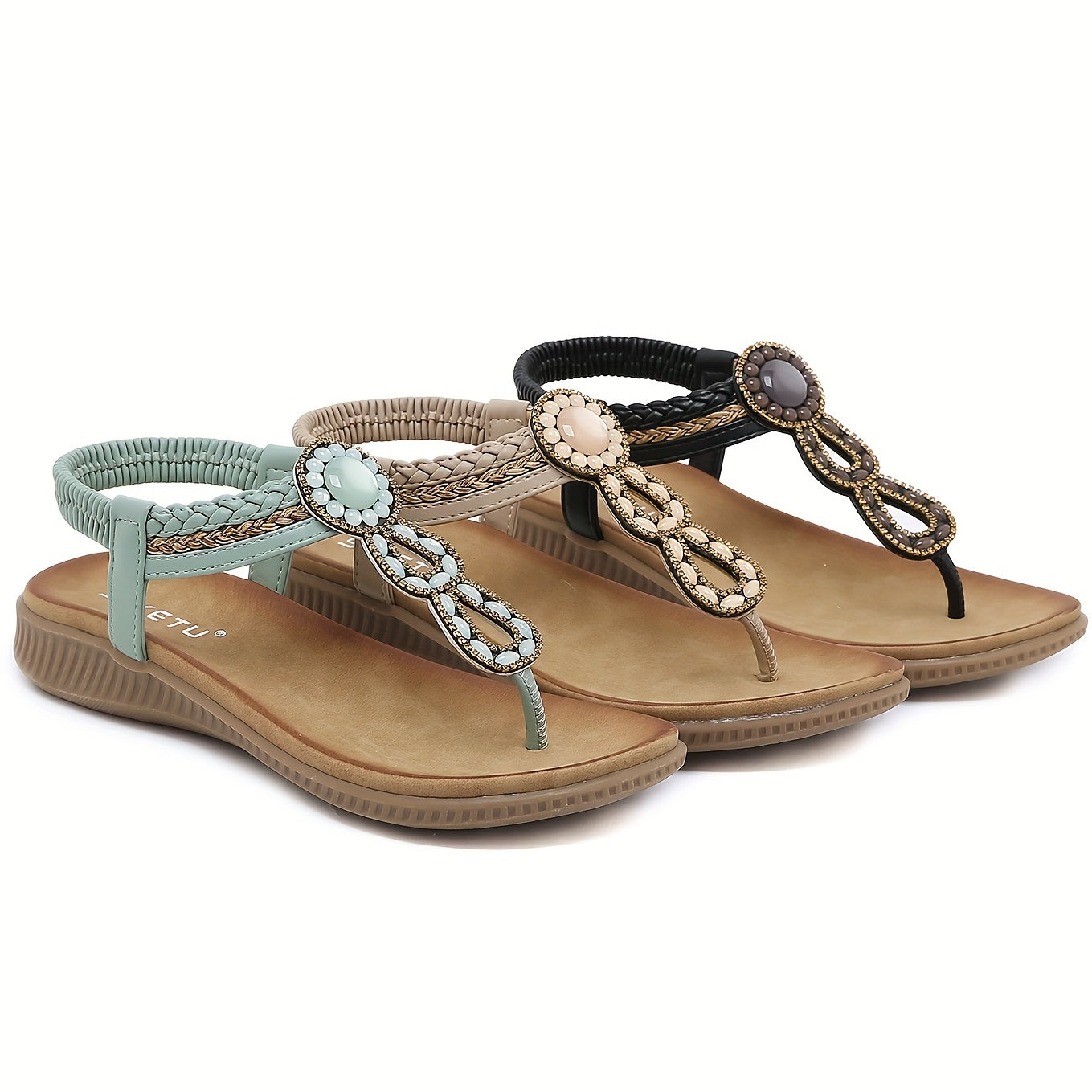 Boho Style Rhinestone T-Strap Sandals for Women - Perfect for Beach Vacations