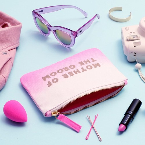 The Mother of the Bride design has been printed in metallic gold on a white canvas and hot pink ombré zip pouch.