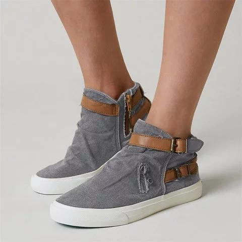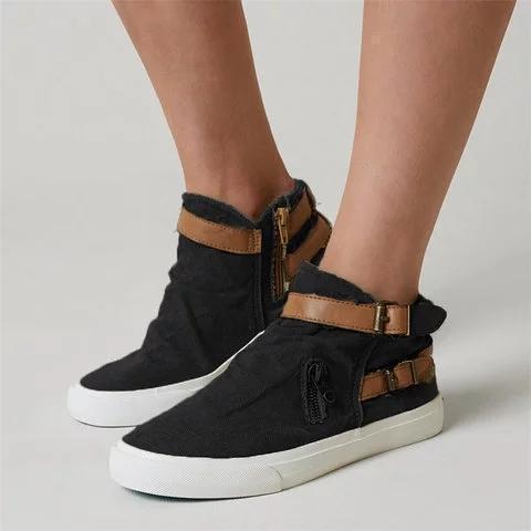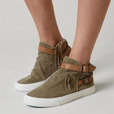 Canvas Ankle Boots Flat Heel Buckle Booties with Zipper