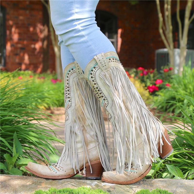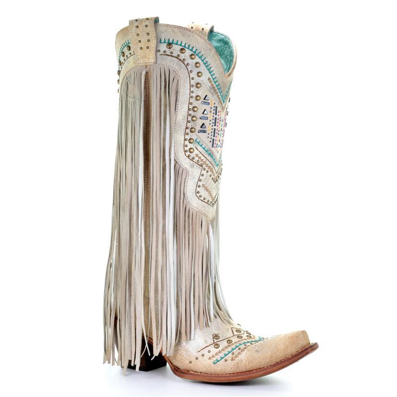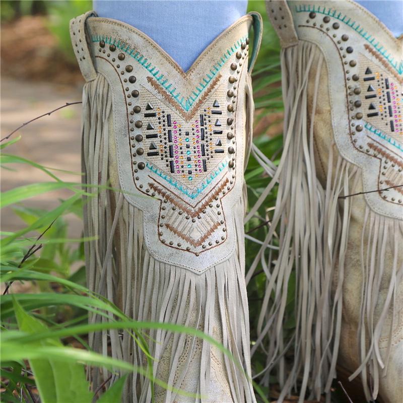 We've loved this boot design in both brown and black, so we're naturally thrilled to debut our best selling fringe Corral Boots in bone! Pops of turquoise embroidery against neutral distressed leather, super cool stud work, and a country chic silhouette make these cowgirl boots a winner for any occasion!