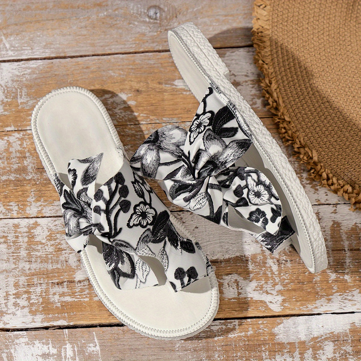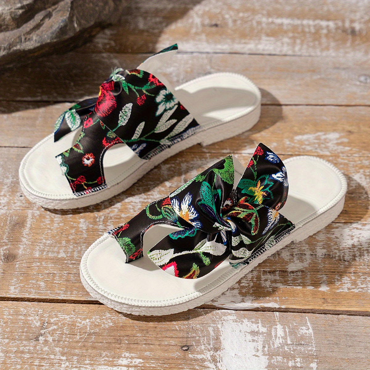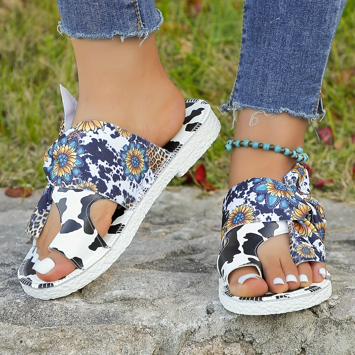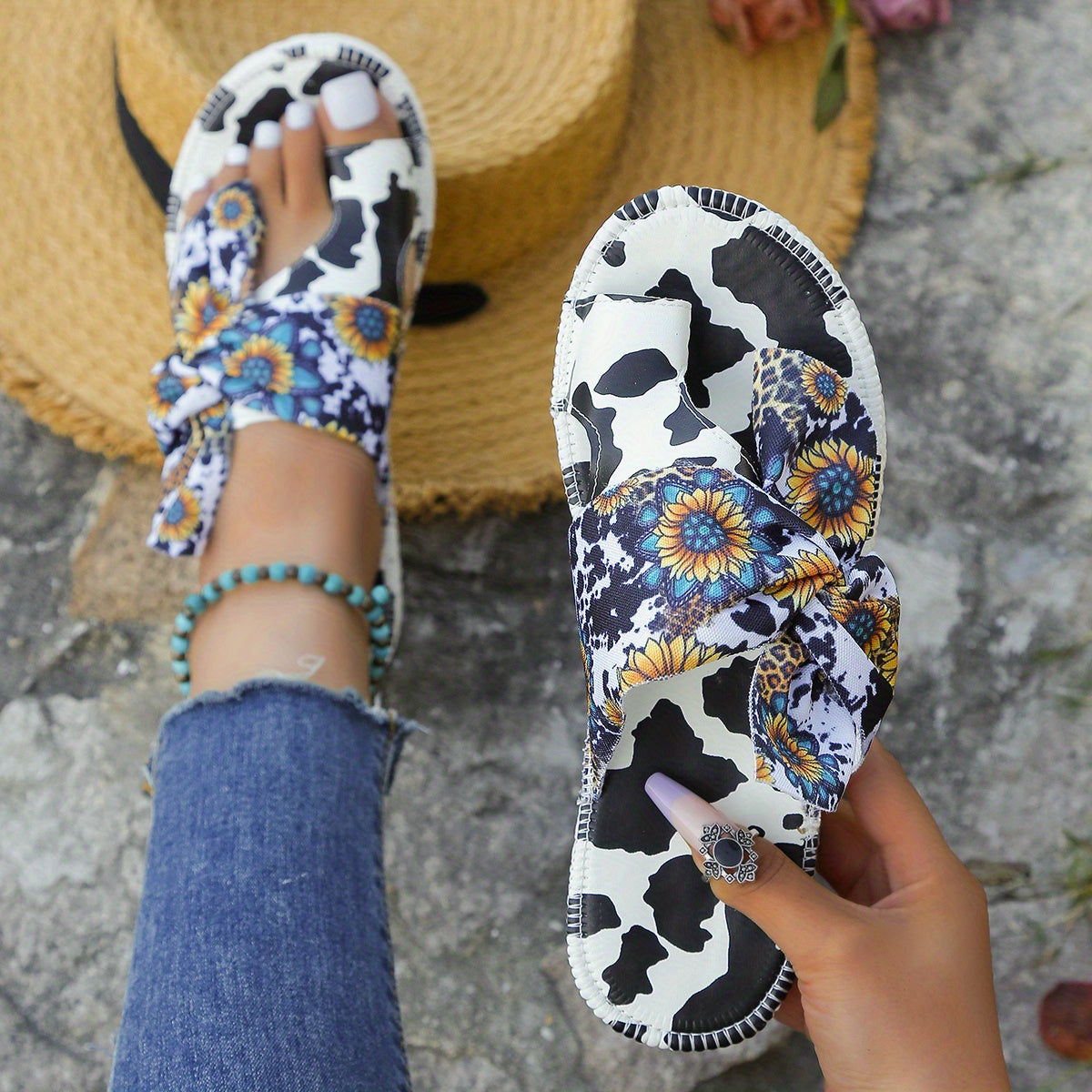 Cow and Sunflower Print Sliders - Stylish Toe Loop Slip-Ons for Women