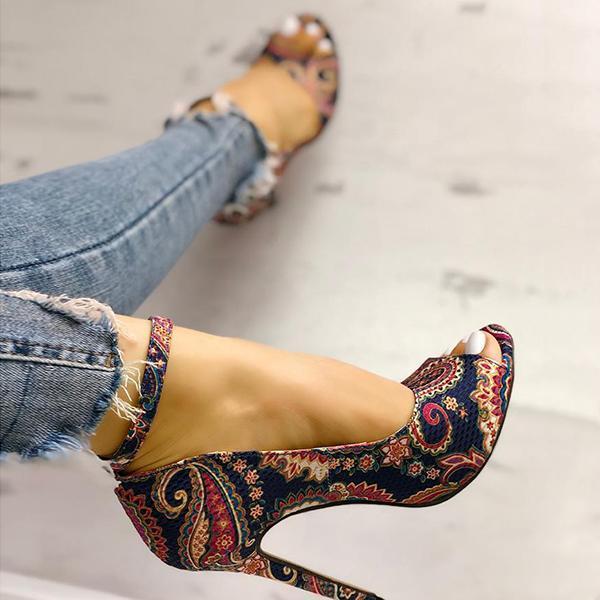 Ethnic Print Peep Toe Ankle Strap Thin Heeled Sandals