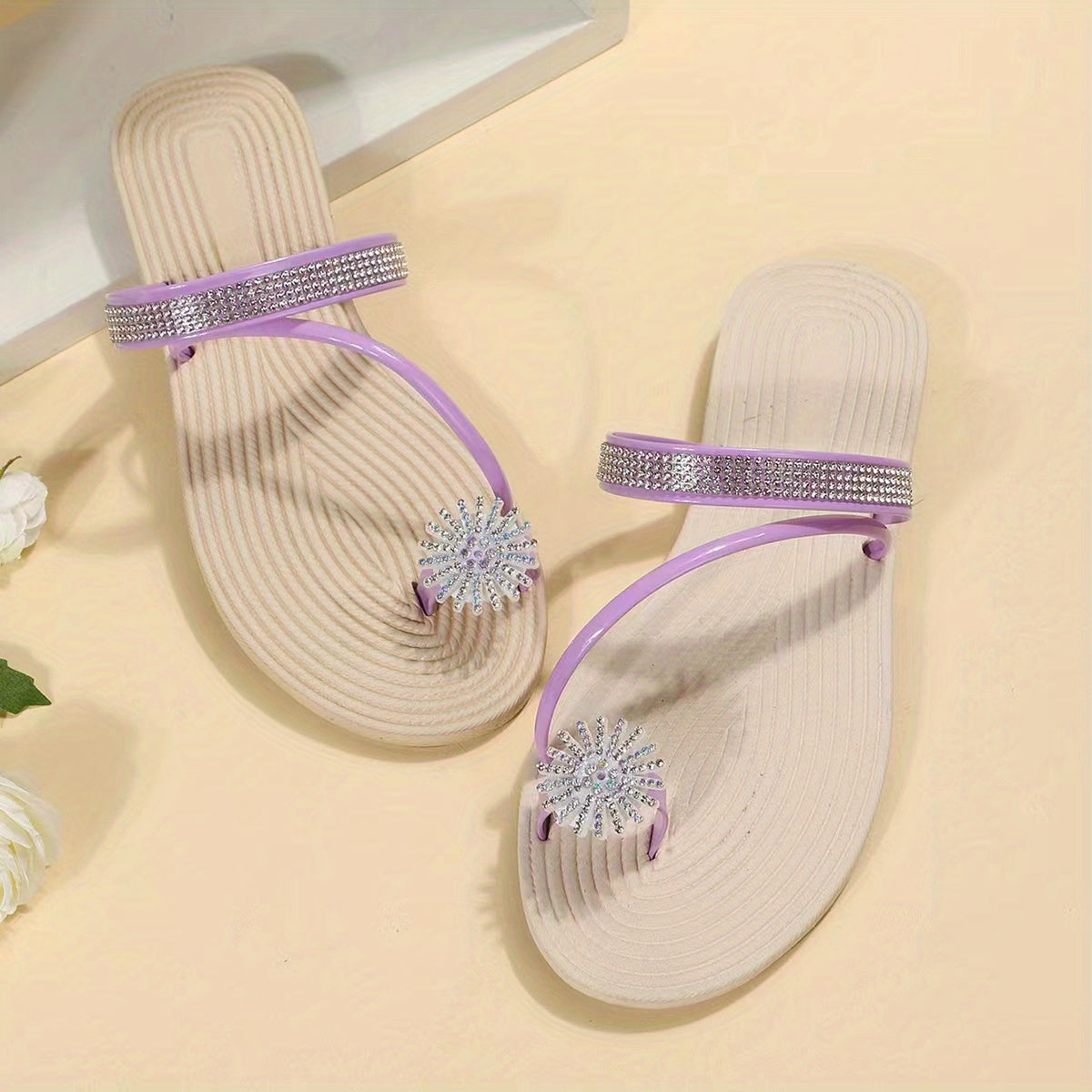 Faux Rhinestone Flat Slippers - Women's Floral Shape, Open Toe Slide