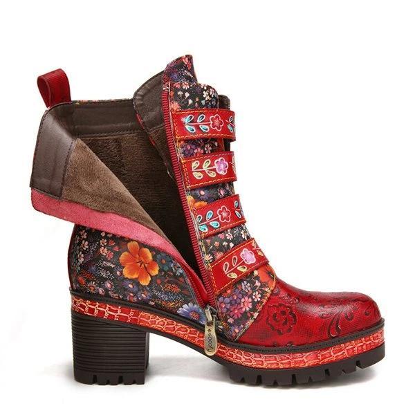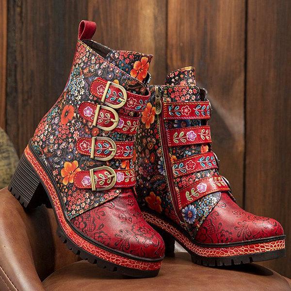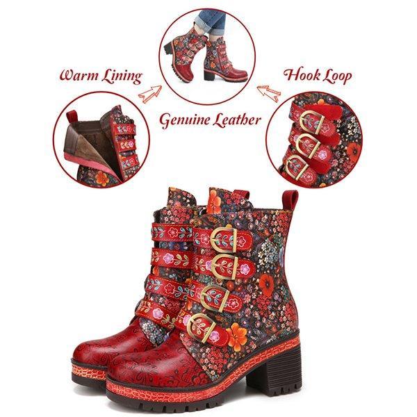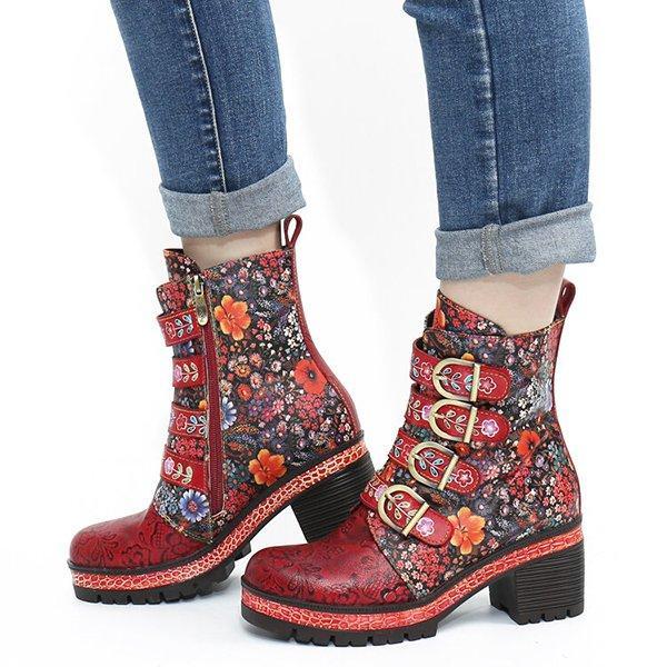 Floral Pattern Metal Buckle Chunky Heel Short Boots
