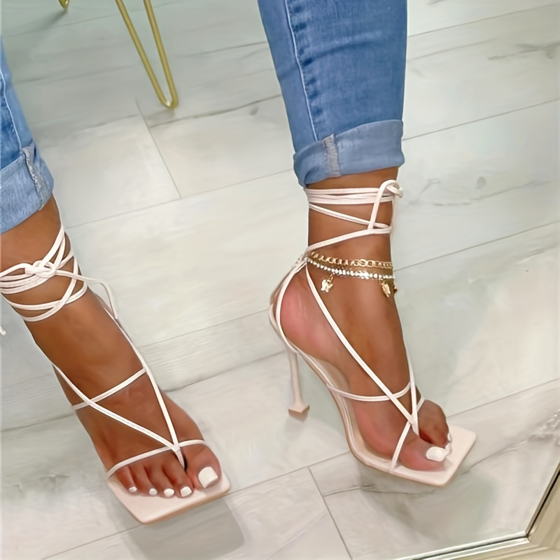 High Heel Sandals with Ankle Straps - Square Toe Stilettos for Women