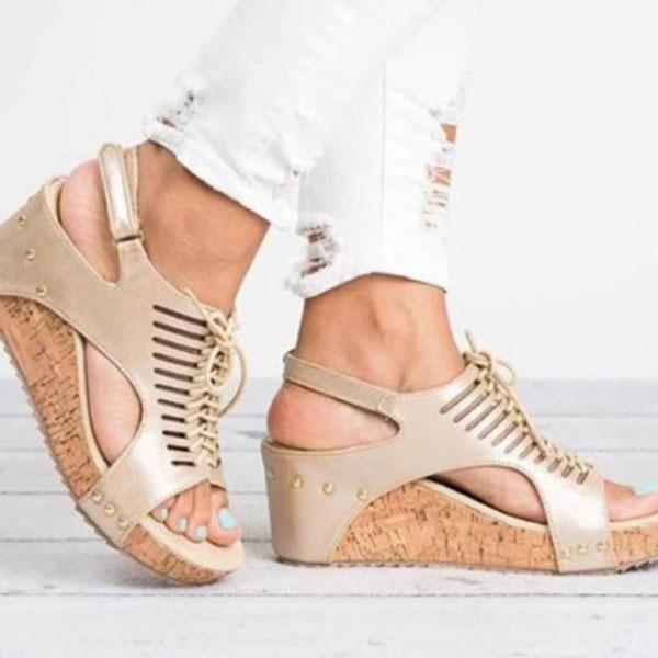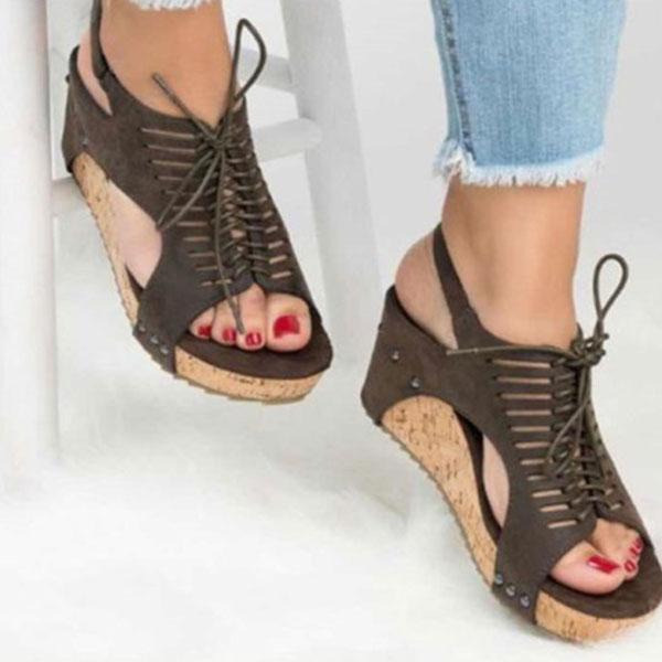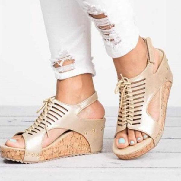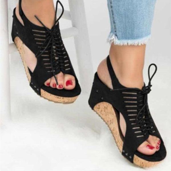 Hollow Lace-up Peep Toe Wedge Sandals