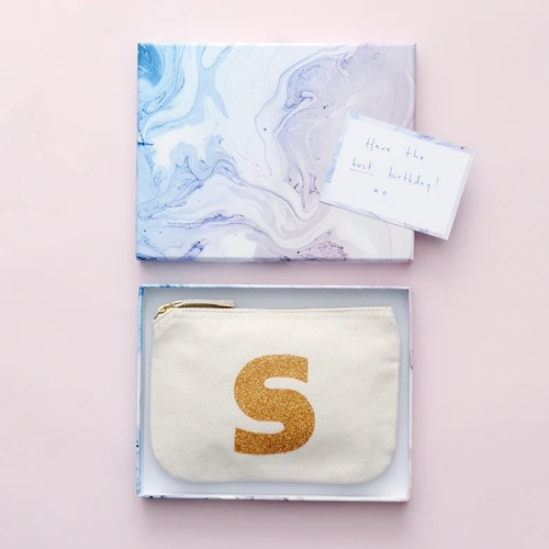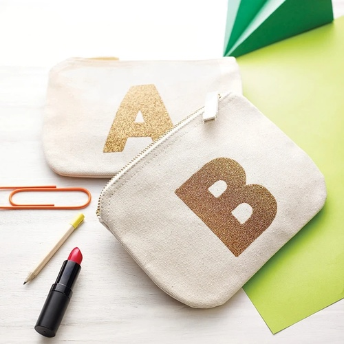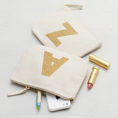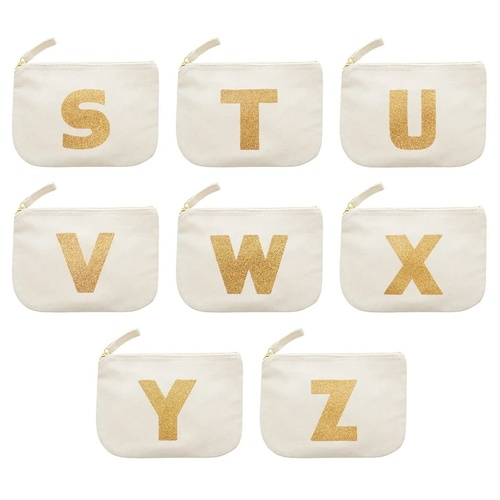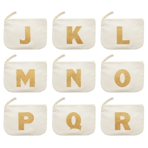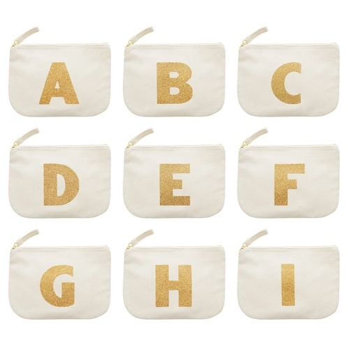 Available in every lovely letter of the alphabet printed in sparkly gold glitter on a heavy natural canvas pouch.