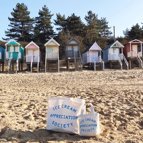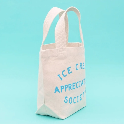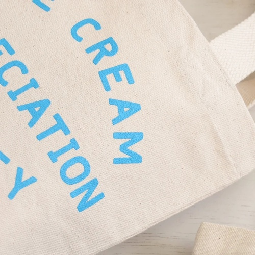 This hand illustrated 'Ice Cream Appreciation Society' design has been printed in blue on sturdy natural canvas.