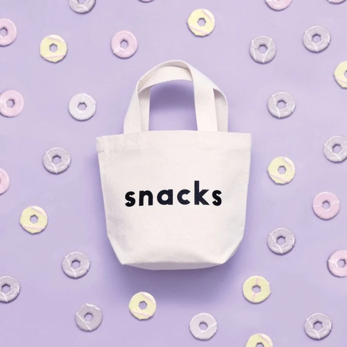 Our 'Snacks' design has been printed in black on sturdy natural canvas.