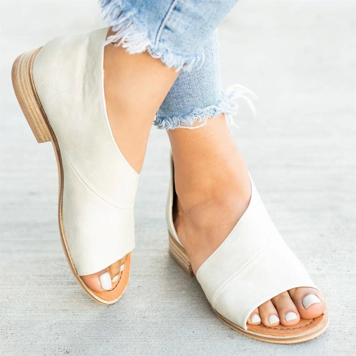 Large Size Women Peep Toe Side Cut Style Stacked Flat Heel Sandals