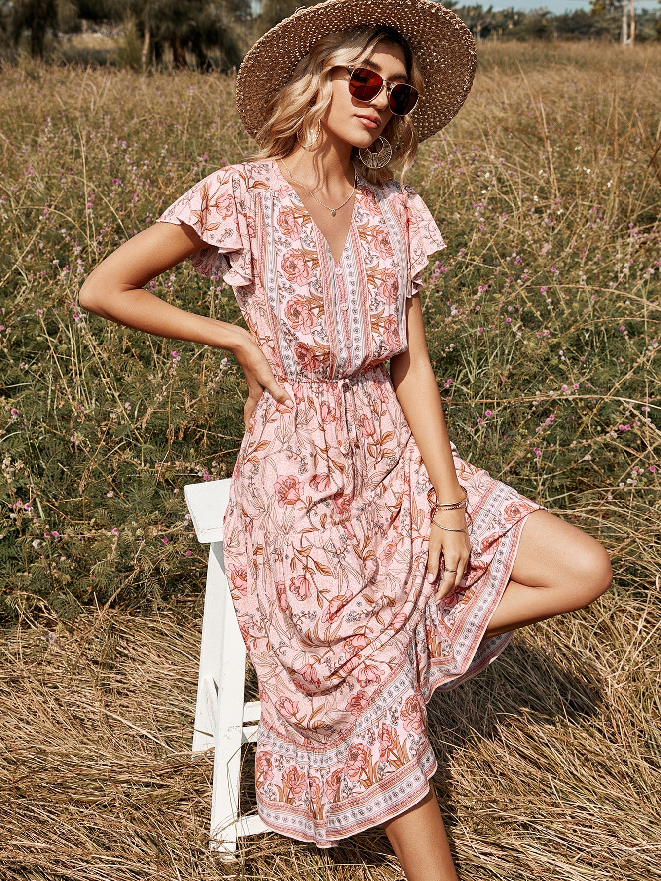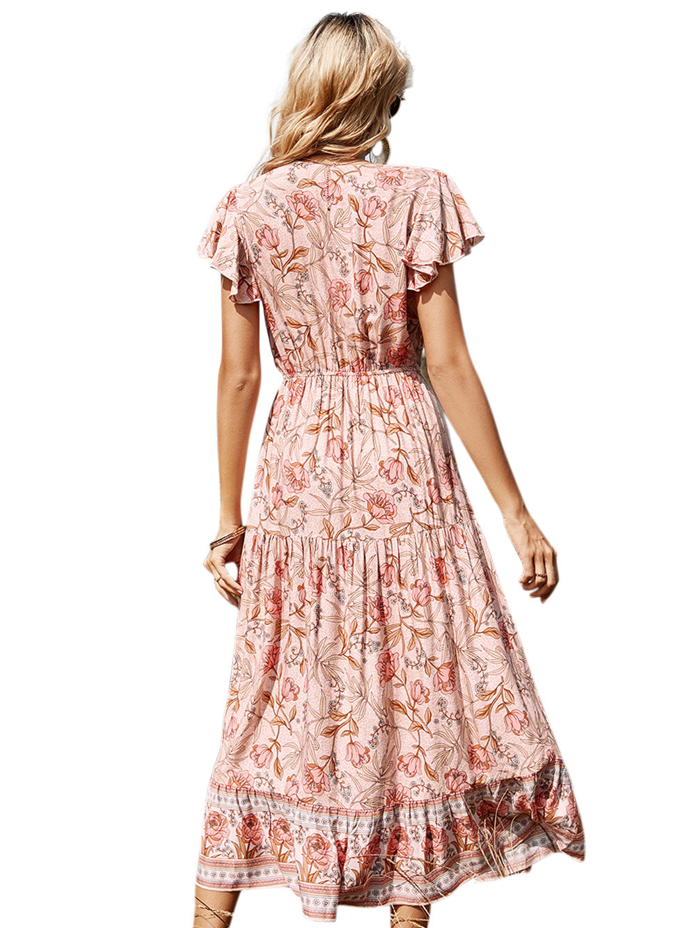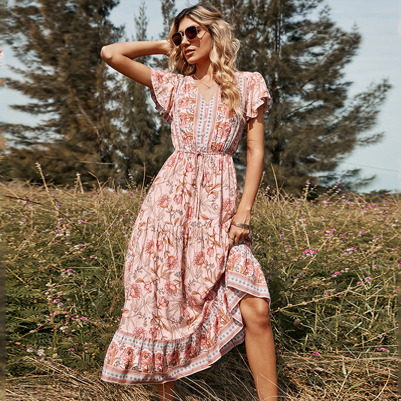 Lotus Leaf Short Sleeve V-neck Mid-length Dress