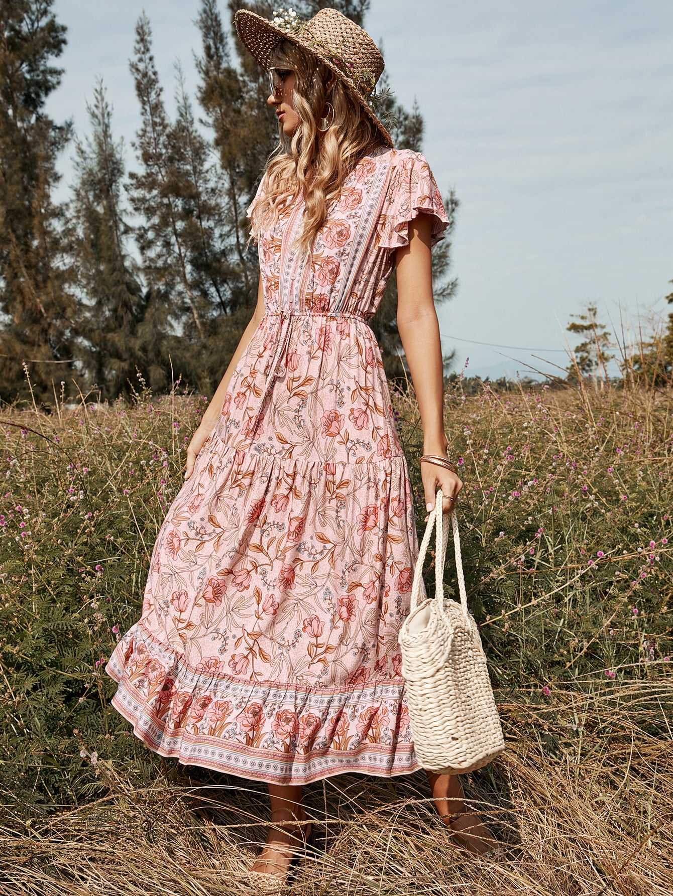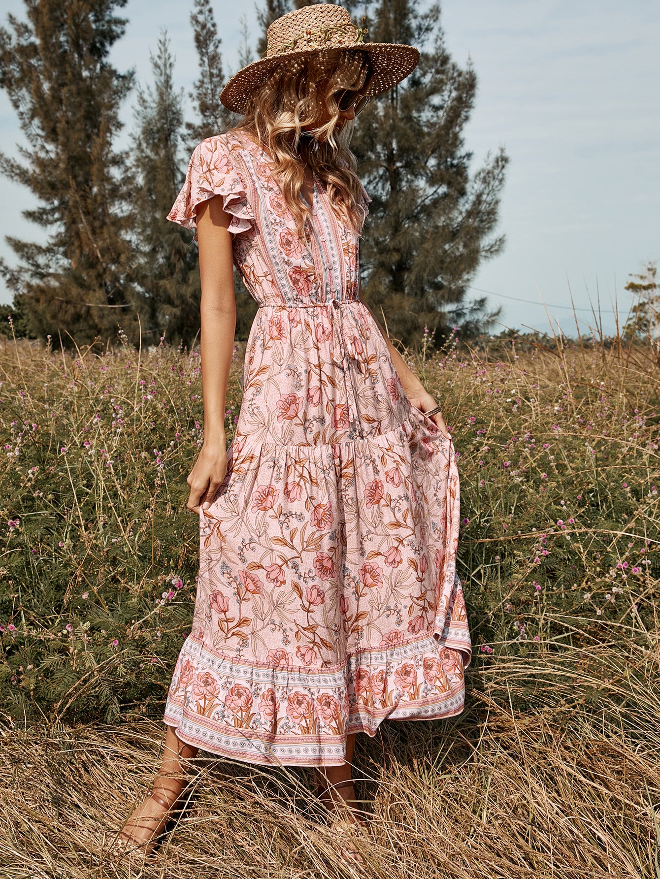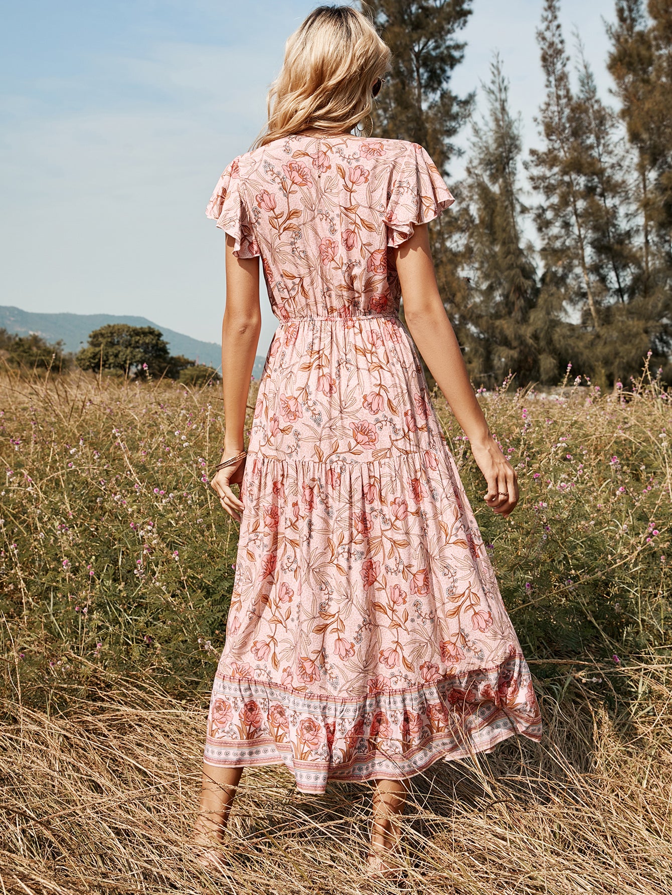 Lotus Leaf Short Sleeve V-neck Mid-length Dress