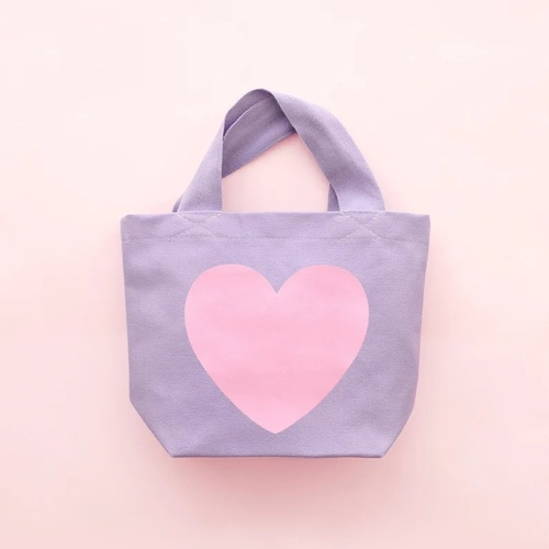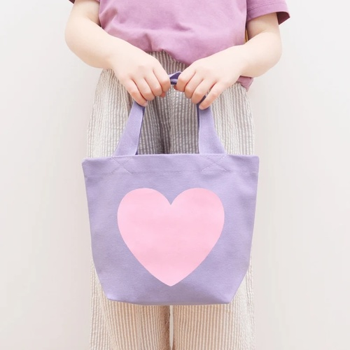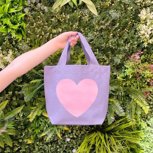 The heart design has been screen printed big and bold in pink on sturdy lavender canvas.