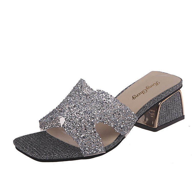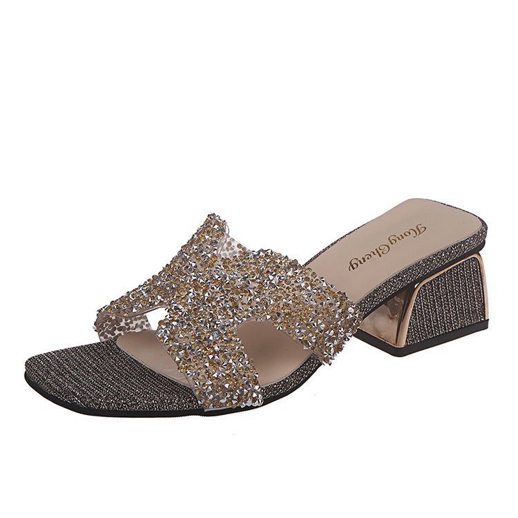 NEWS! Women PU Chunky Heel Wedge Sandals Peep Toe Slippers with Rhinestone Shoes