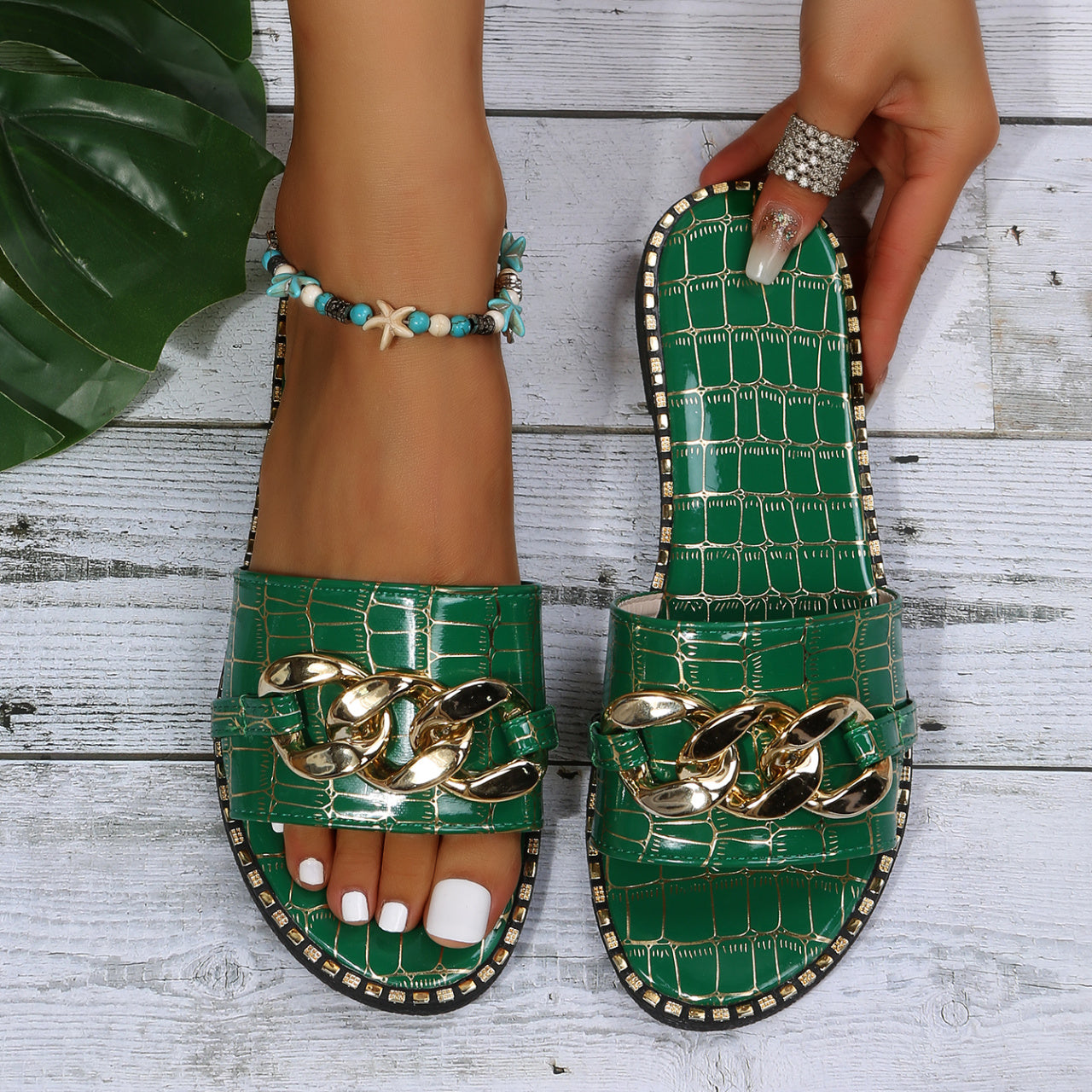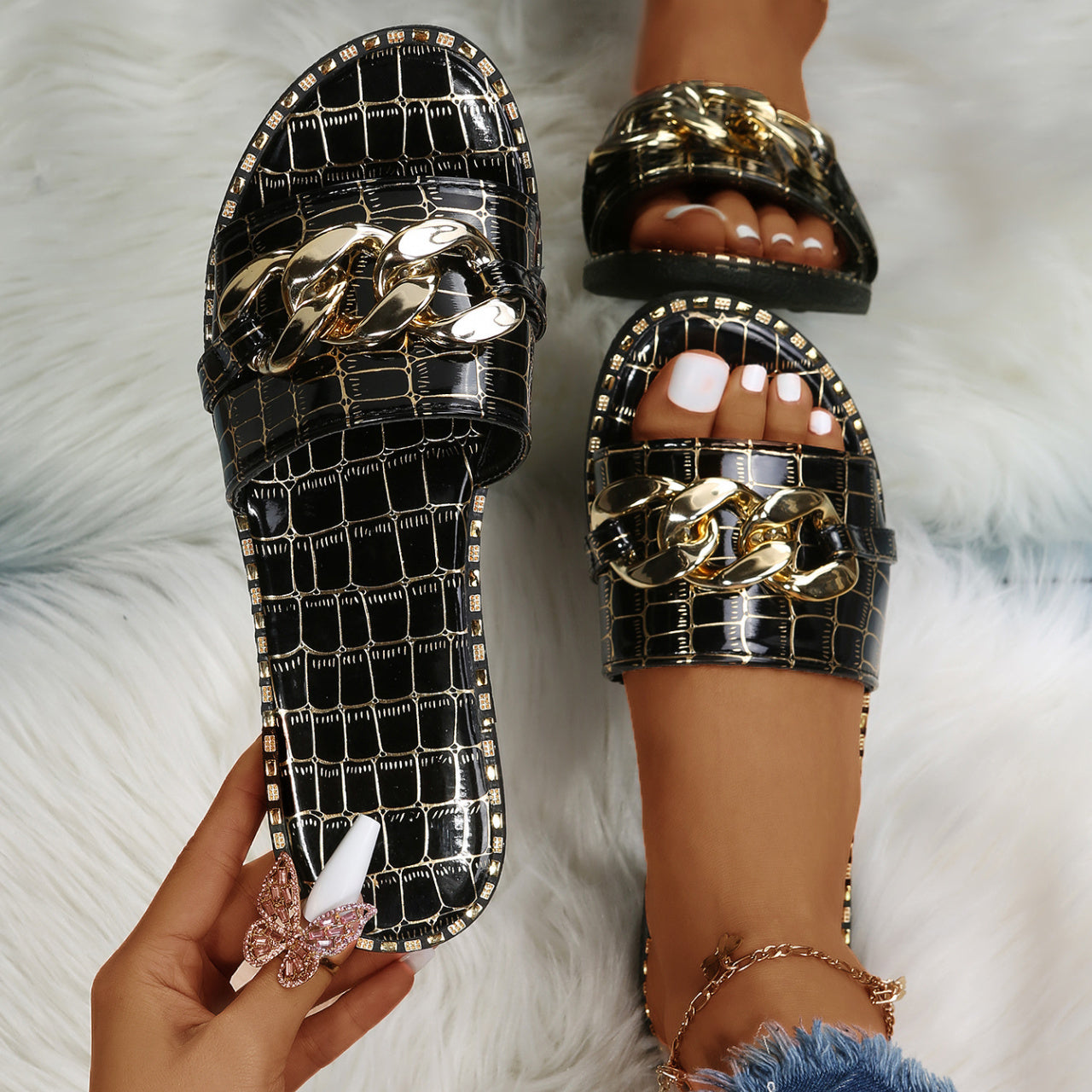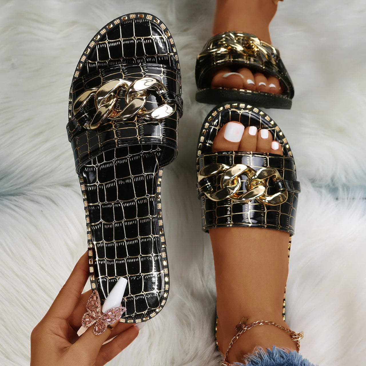 Non-Slip Women's Patent Leather Slides with Metal Chain Décor