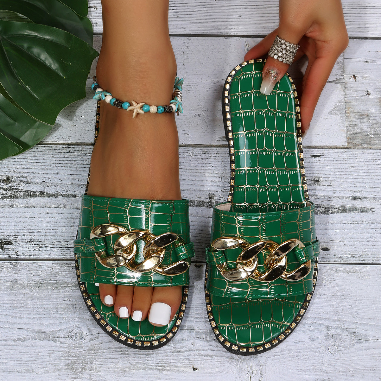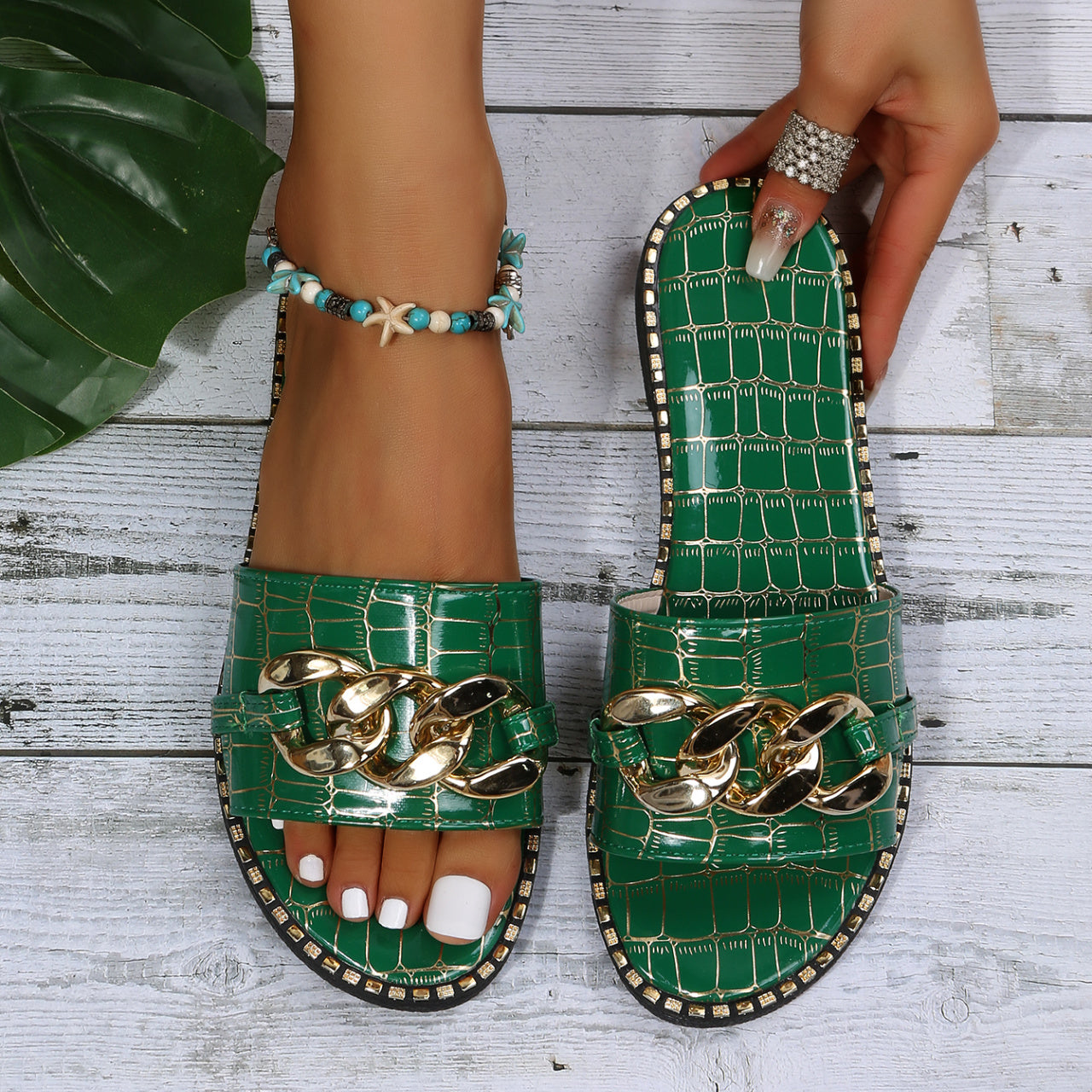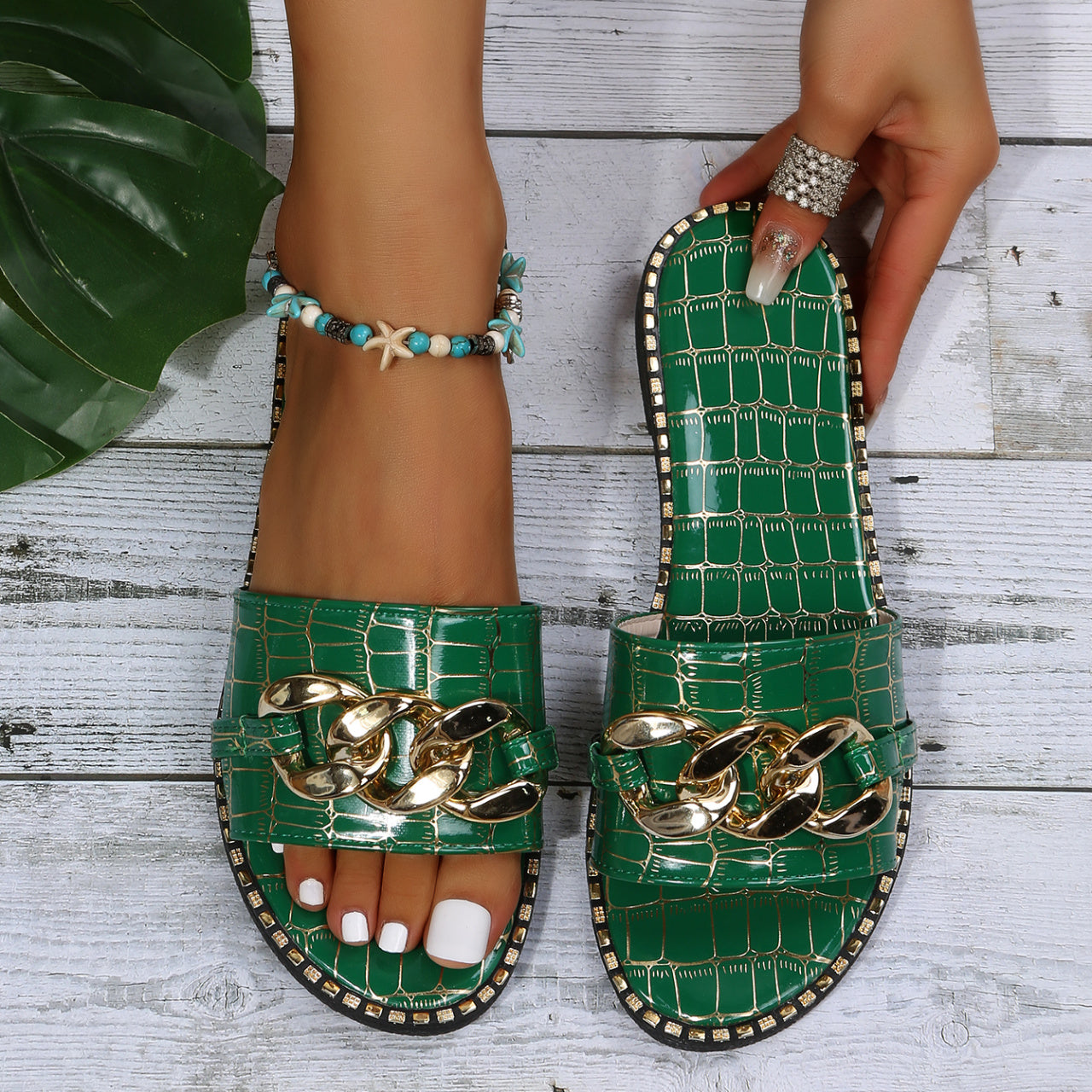 Non-Slip Women's Patent Leather Slides with Metal Chain Décor