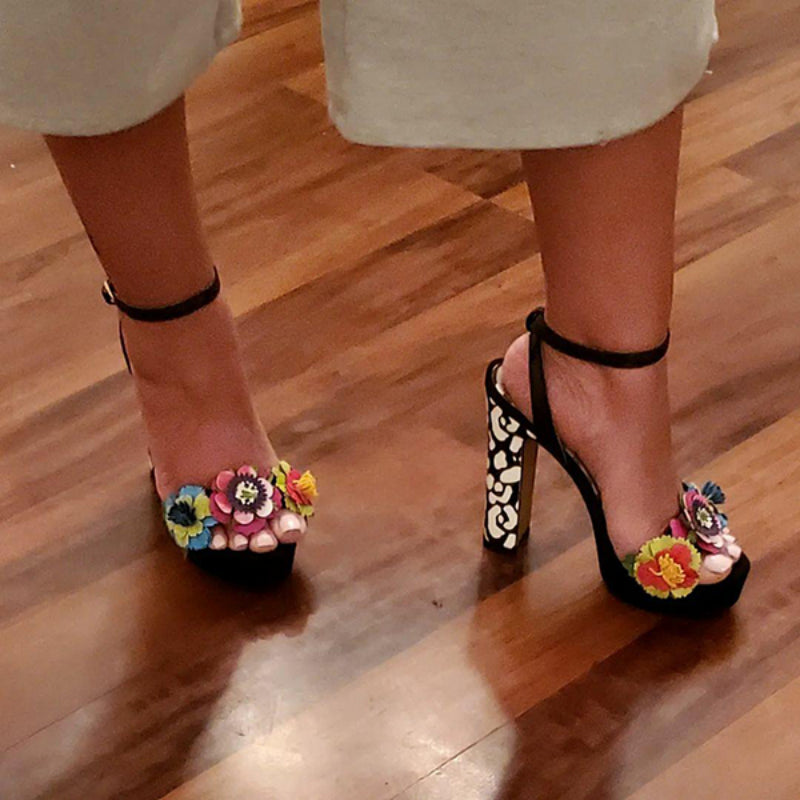 Open Toe Chunky Heel Sandals - Women's 3D Floral Ankle Strap High Heels