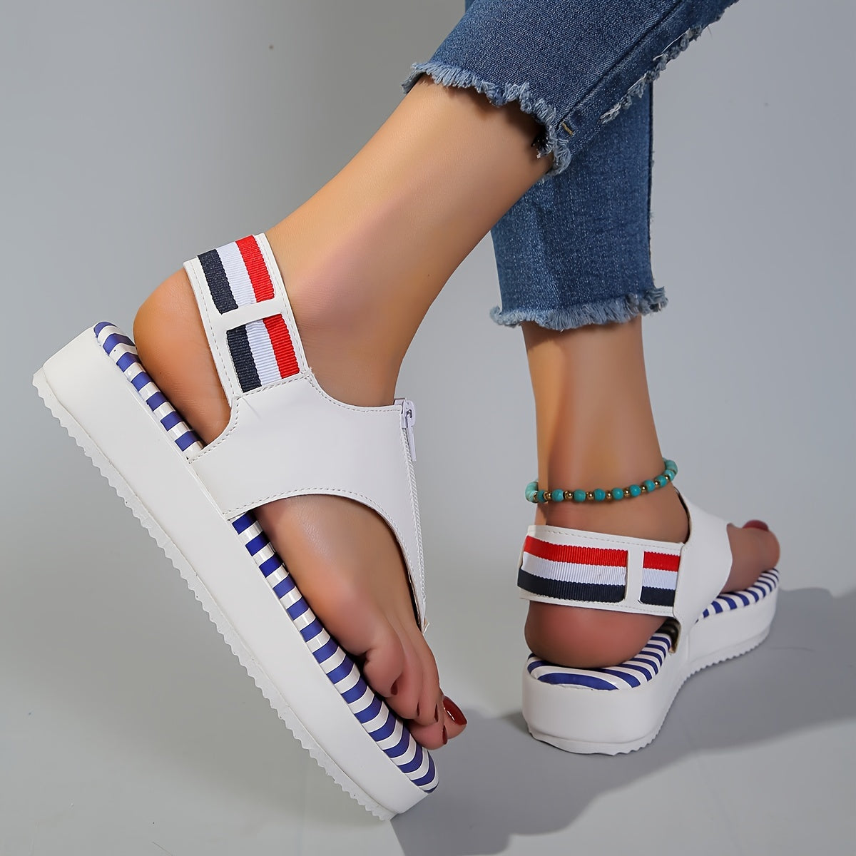 Open Toe Striped Sandals for Women, Front Zipper Slingback, Anti-Skid Soles