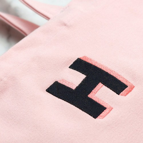 Beautifully embroidered in two thread colours, black with a contrasting pink drop shadow.