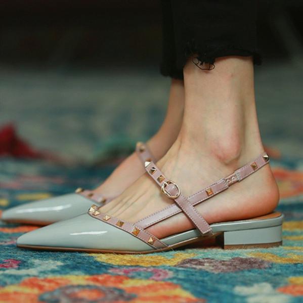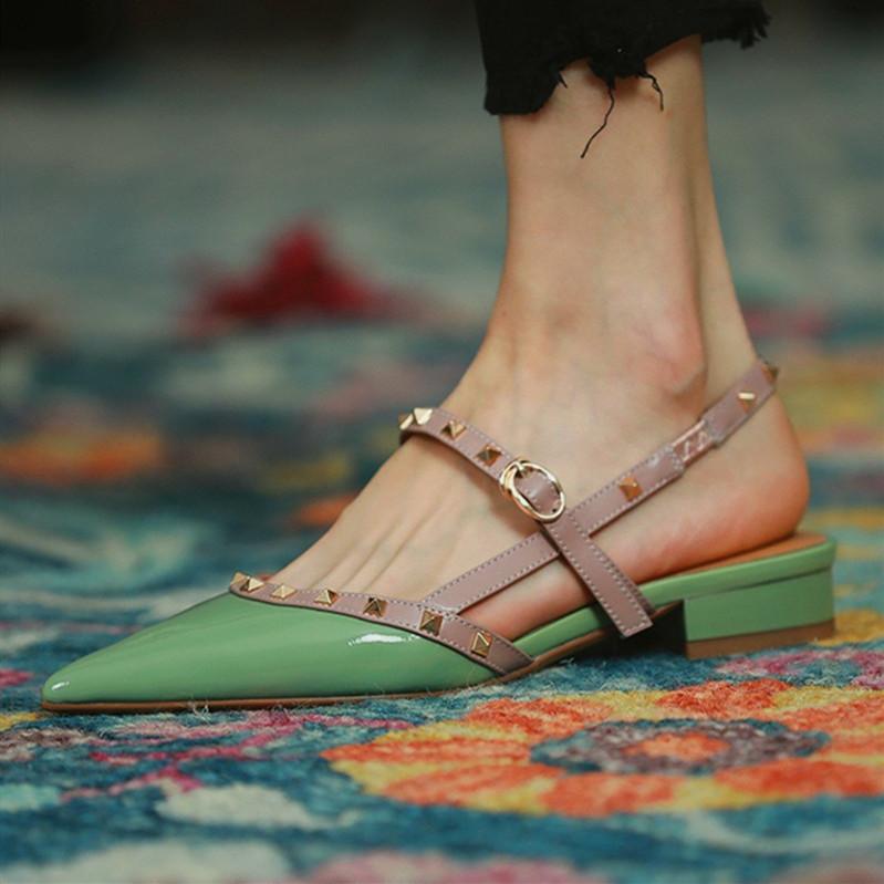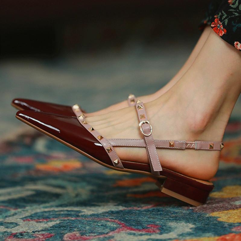 Pointed-toe Solid Color Splicing Studded Buckle Flat Sandals