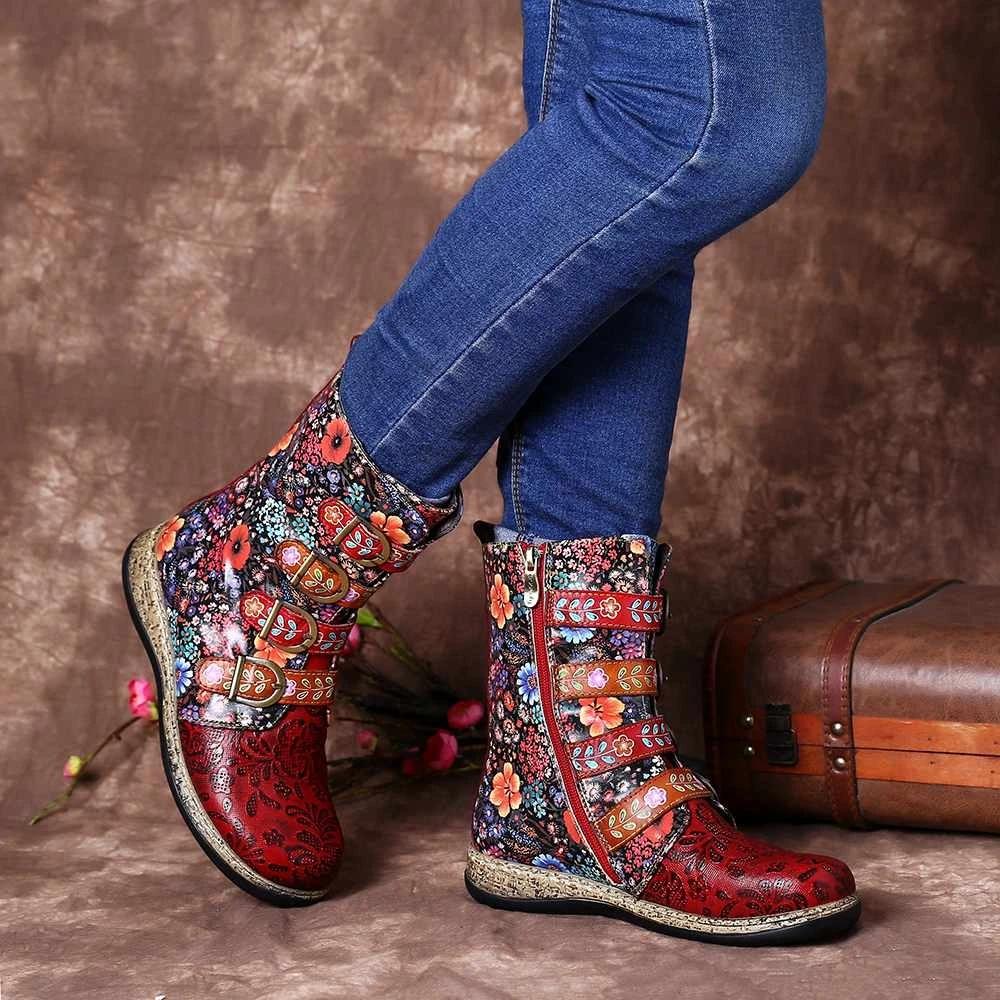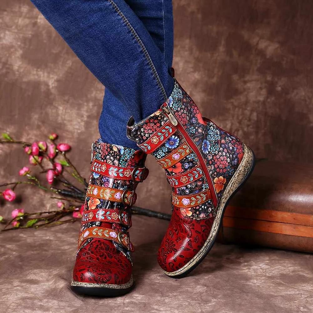 Floral Pattern Metal Buckle Chunky Heel Short Boots