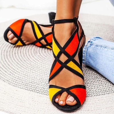 Women Hit Color Peep Toe Buckle Strap Chunky Heel Sandals