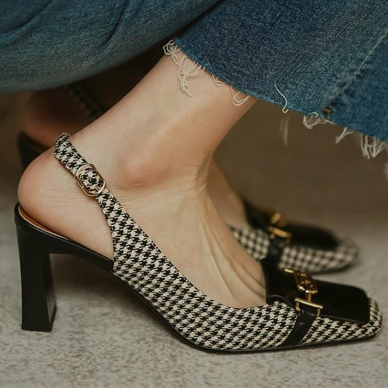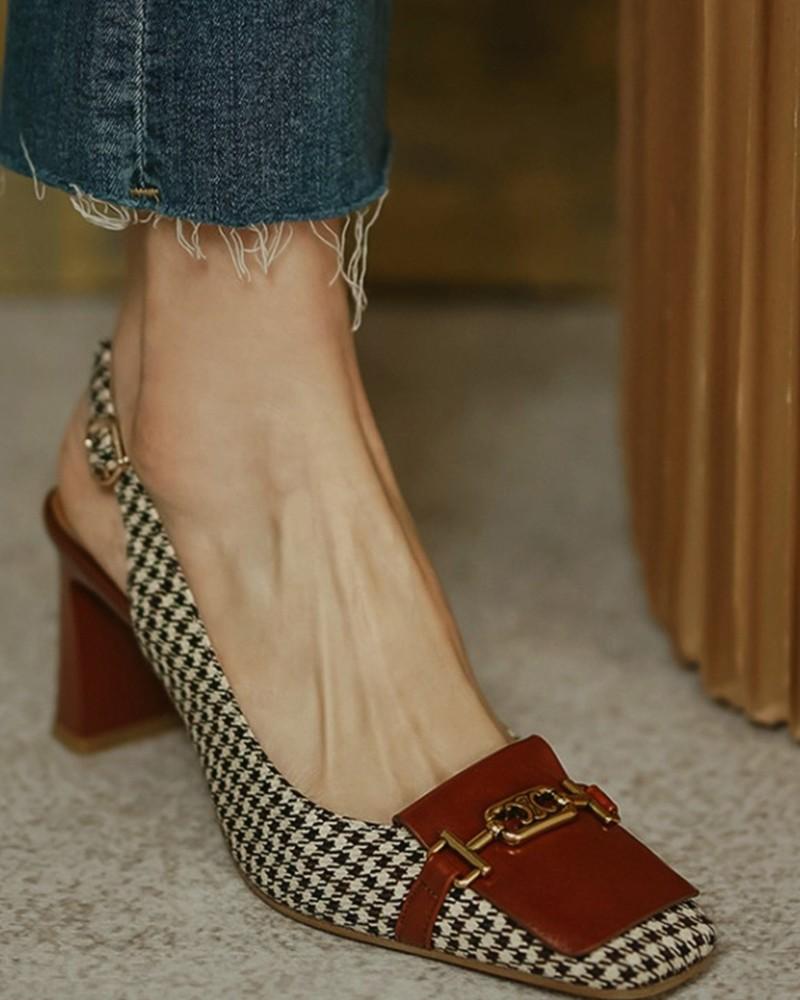 Square-toe Houndstooth Print Splicing Buckle PU Leather High Heels