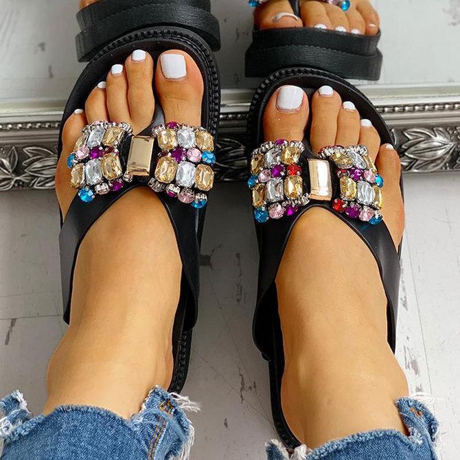 Women Rhinestones Pearl Pineapple Thongs Buckle Strap Flat Heel Sandals