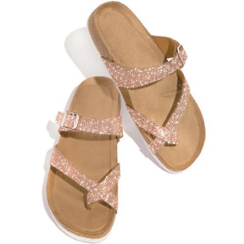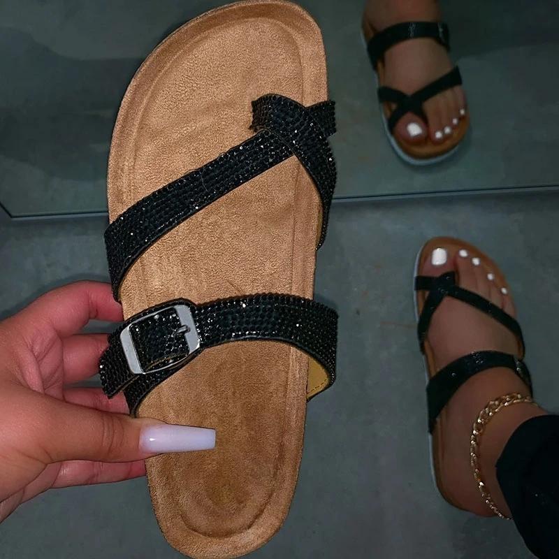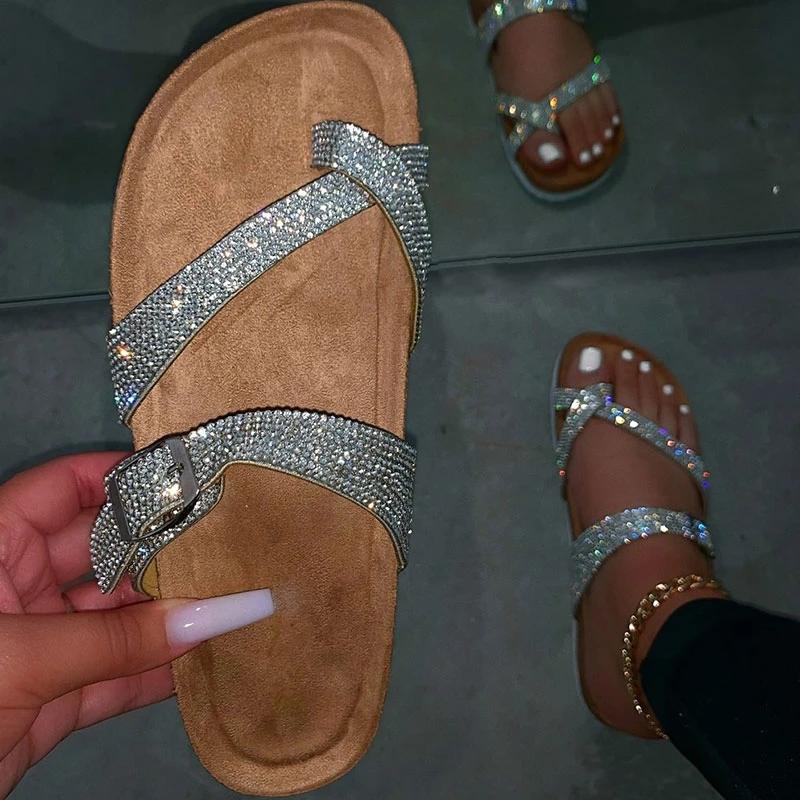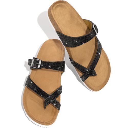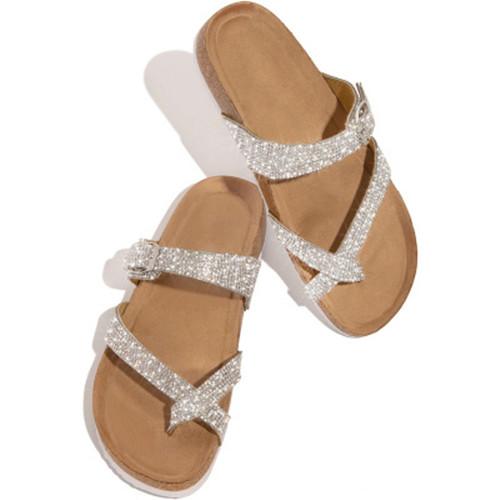 Summer Artificial Leather Rhinestone Flat Heel Slippers
