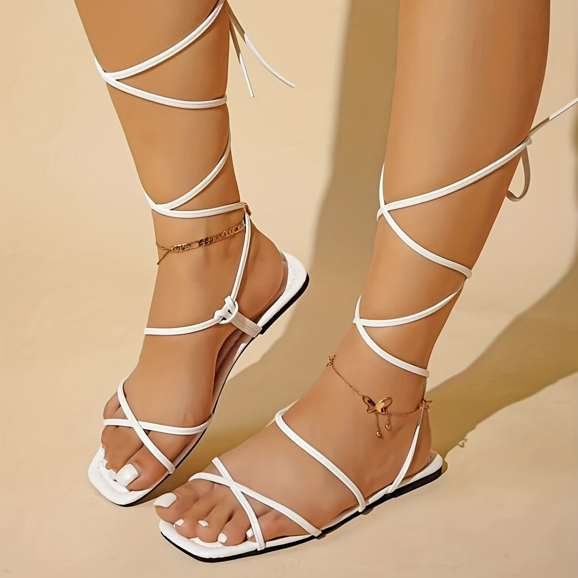 Summer Beach Sandals: Women's Strappy Lace-Up Flats in Solid Colors