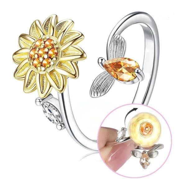 Charming and bright , the Sunflower Ring contains a rotating flower in its center, giving the piece exclusivity .