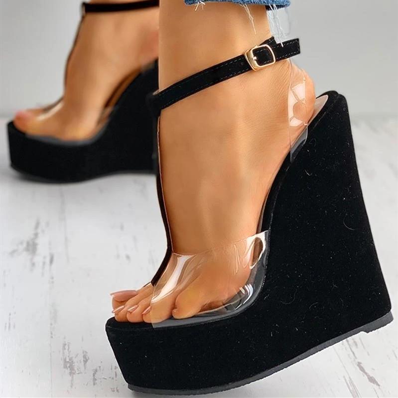T-strap Wedges Buckled Ankle Strap Black Slingback Sandals
