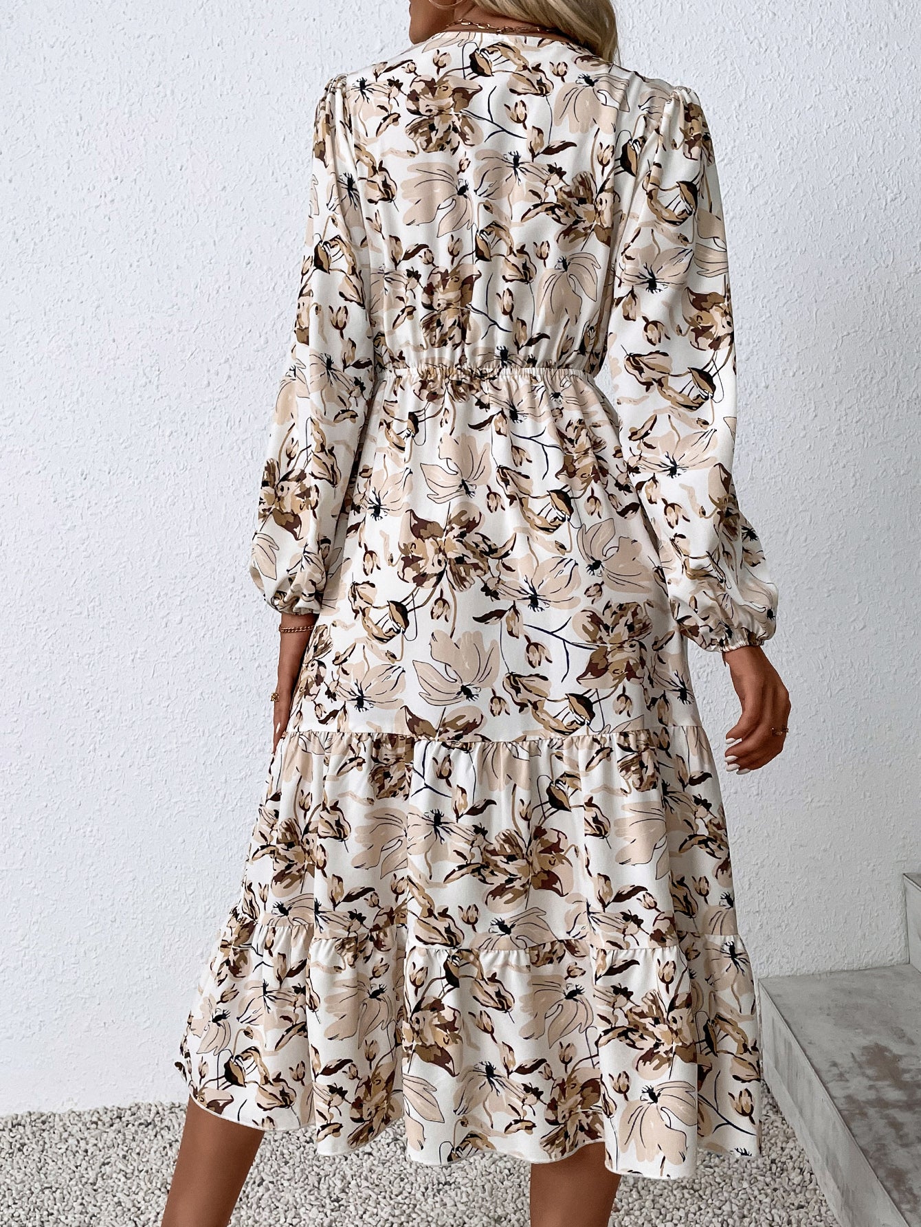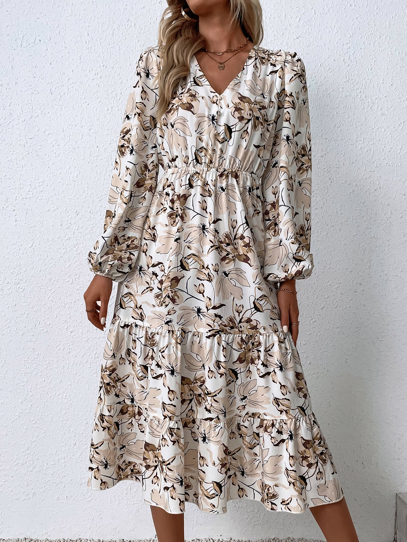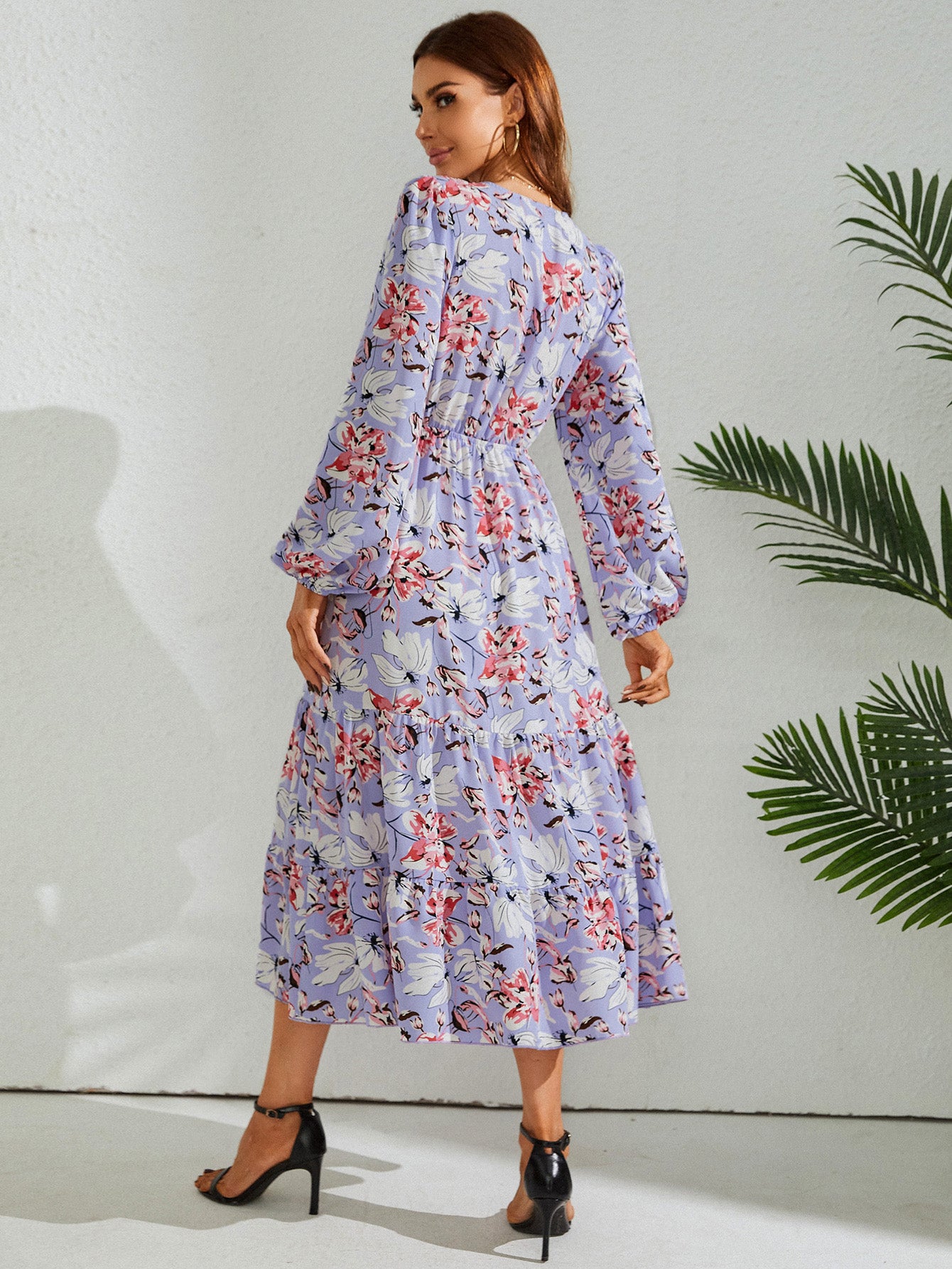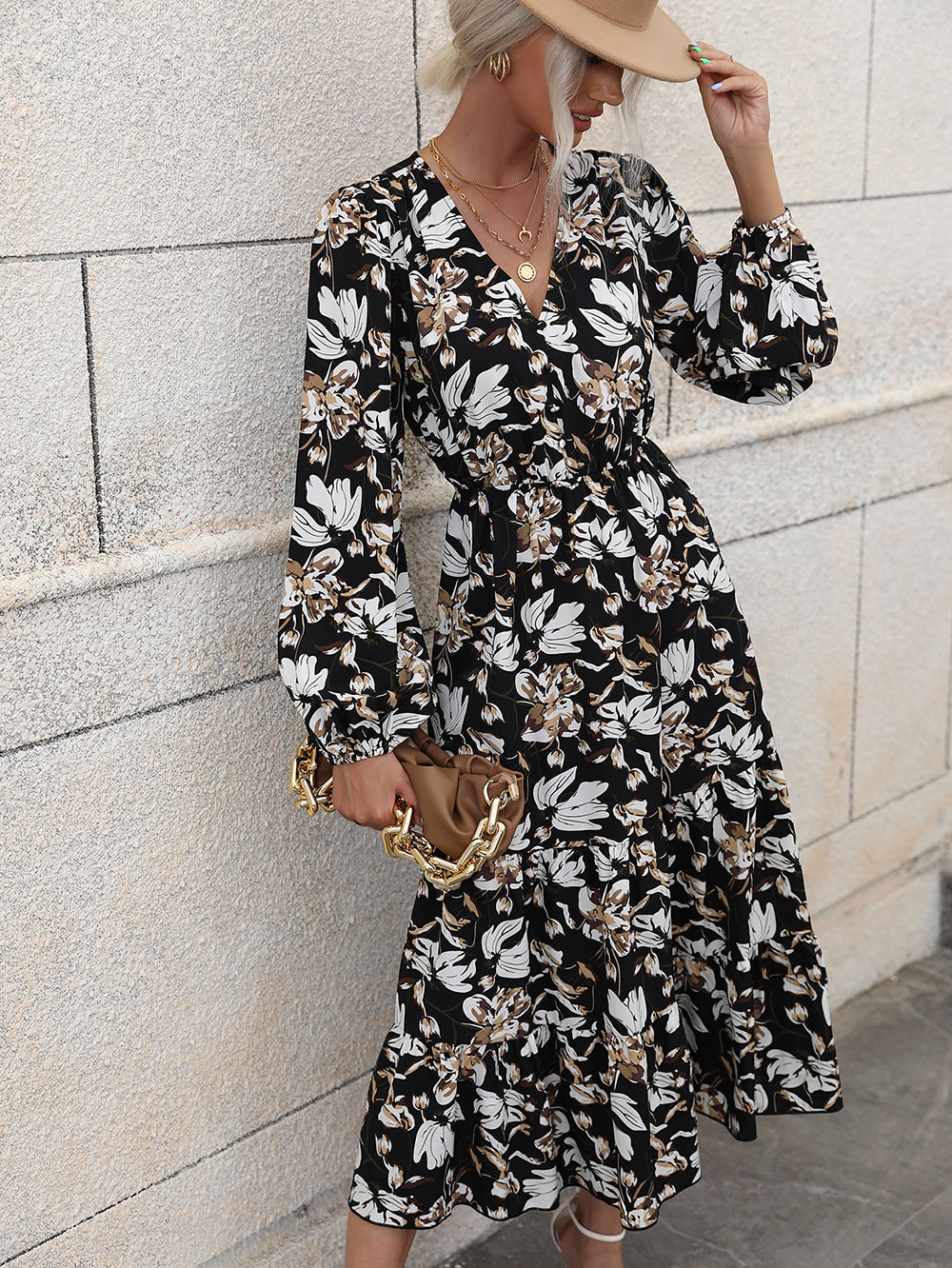 Lotus Leaf Short Sleeve V-neck Mid-length Dress