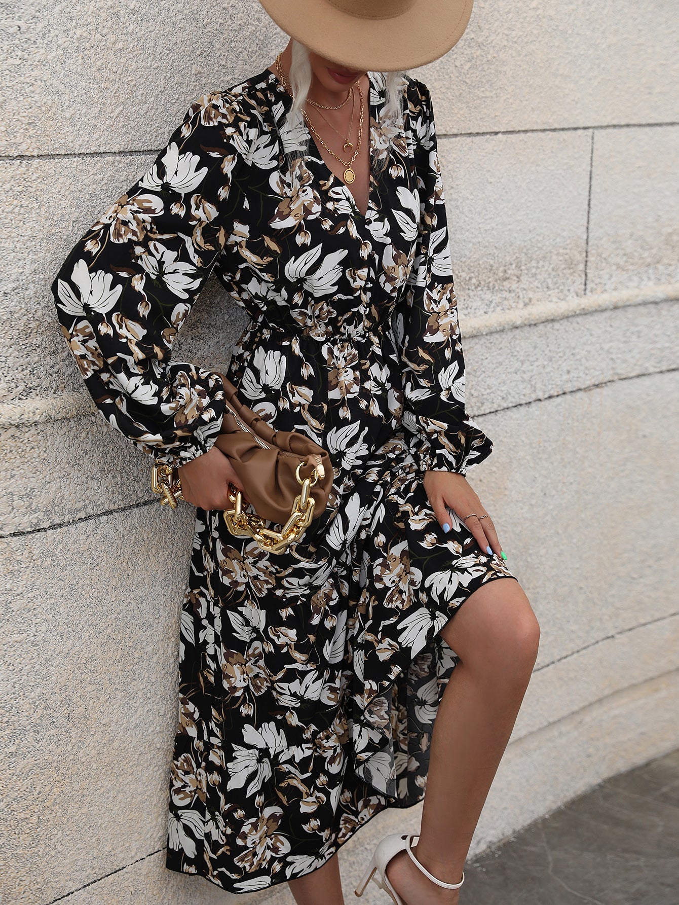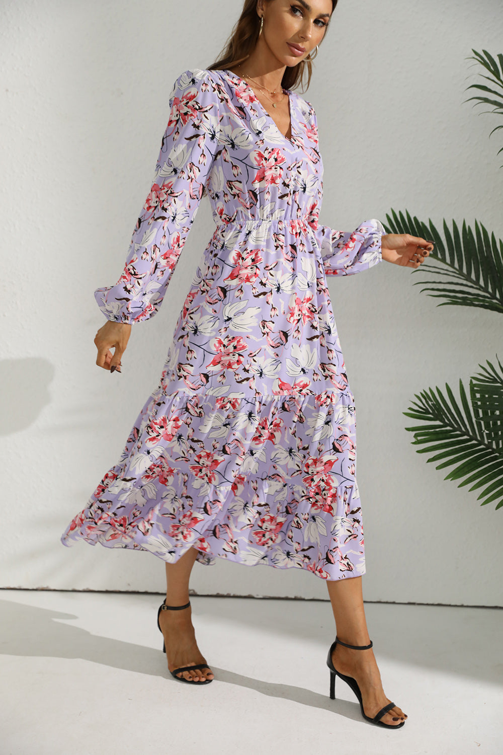 Pink Waist Strap Slim V-neck Long Sleeve Print Dress