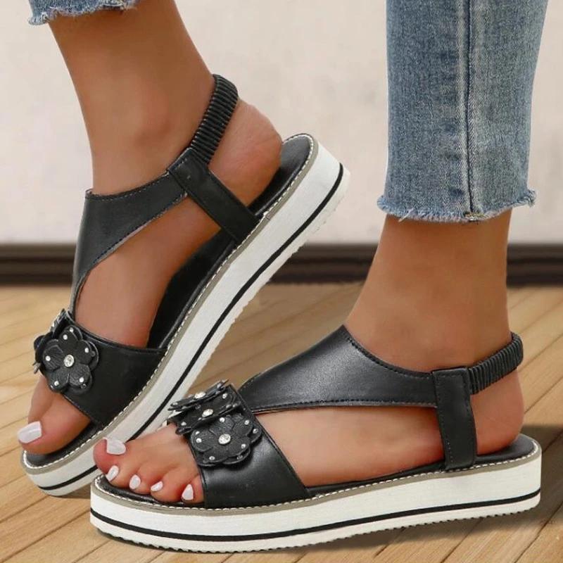 Women Casual Comfy Pu Flower Adornment Rhinestone Elastic Band Flat Sandals