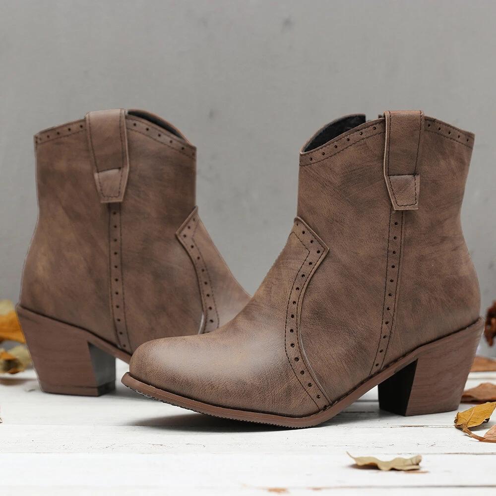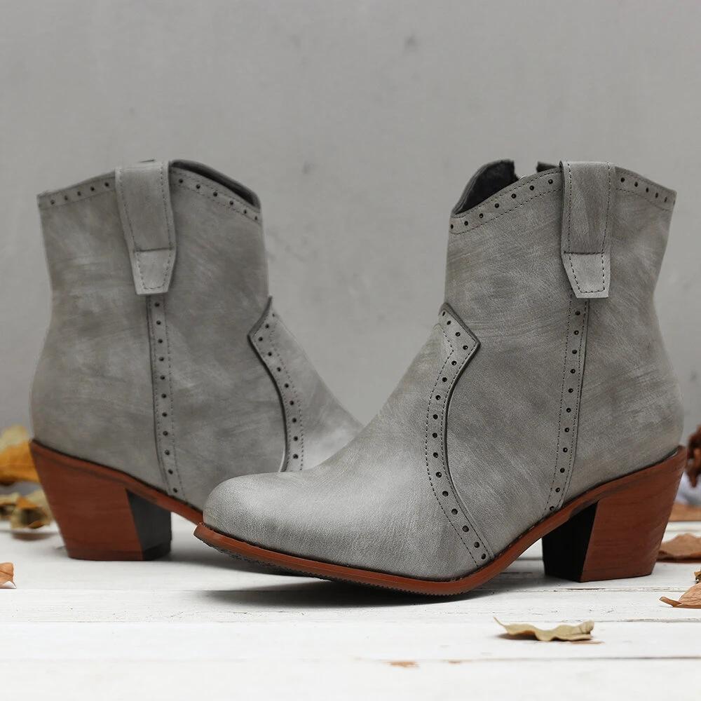Women Casual Retro Pointed Toe Zipper Chunky Heel Ankle Boots