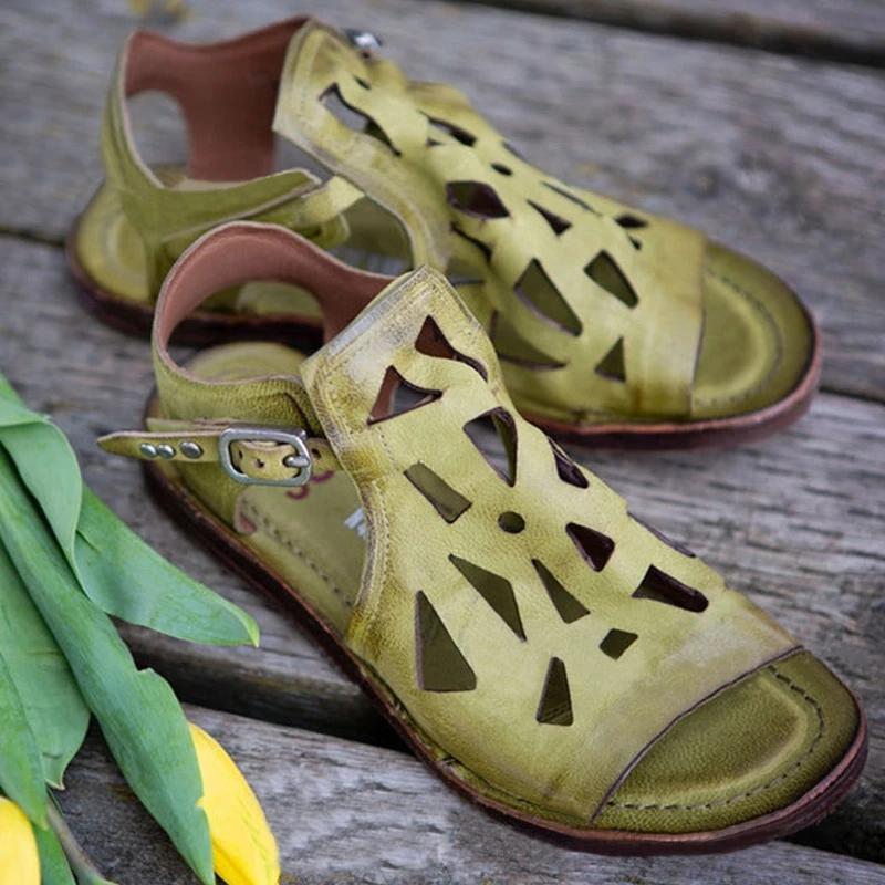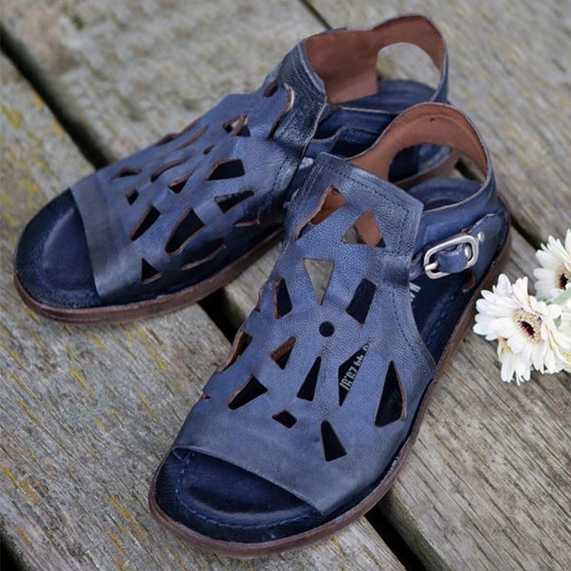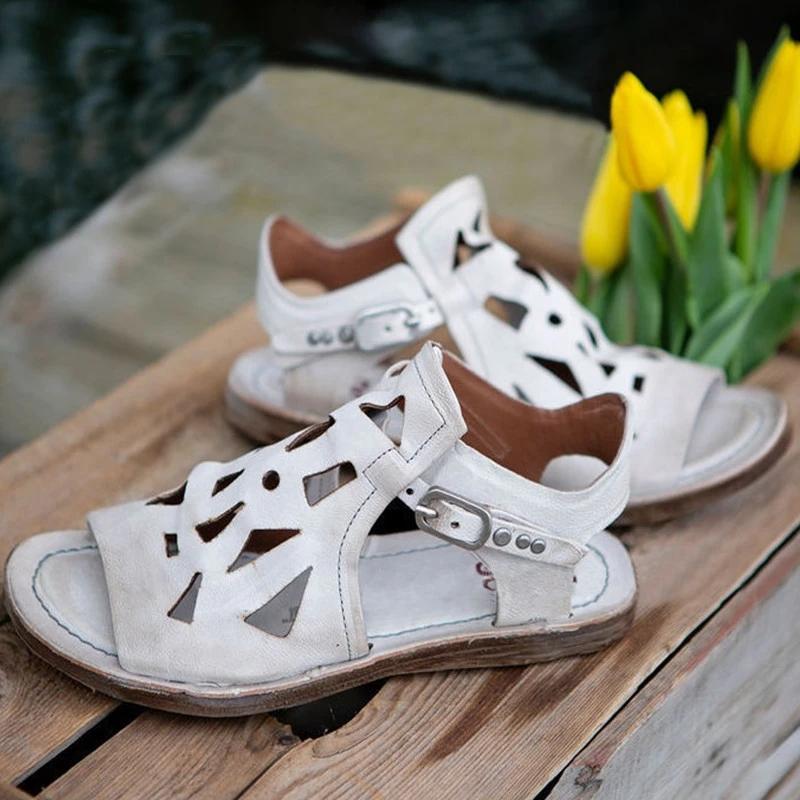 Women Casual Retro Pu Hollow-out Adjusting Buckle Flat Sandals