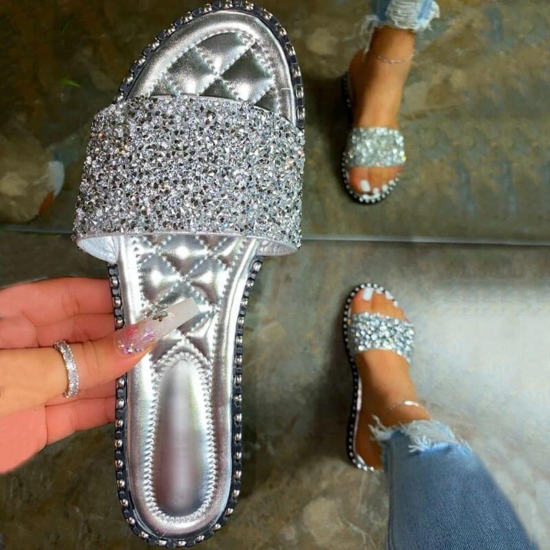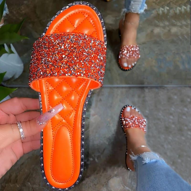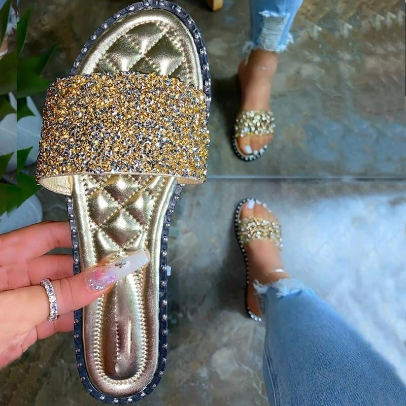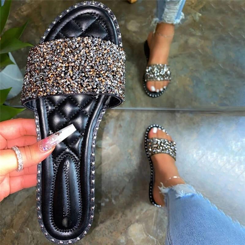 Women Casual Shining Paillette Open Toe Slip On Flat Heel Slippers