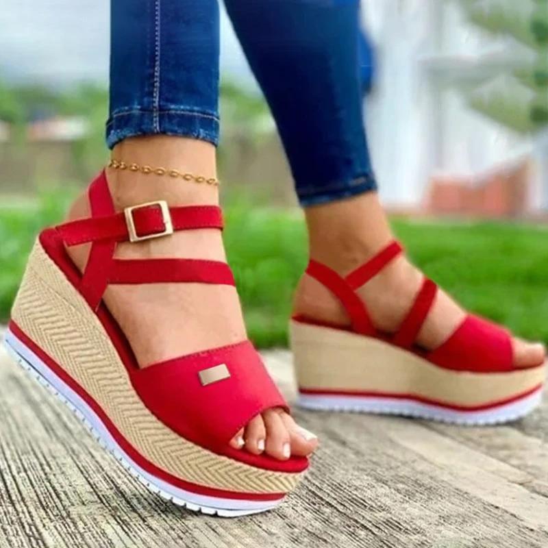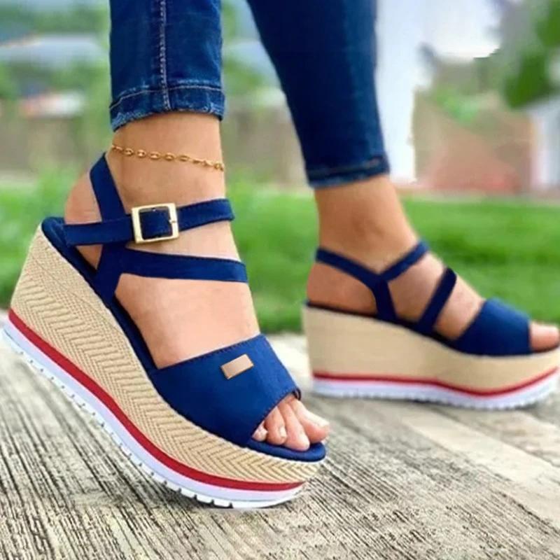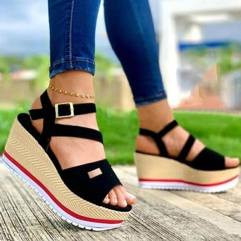 Women Casual Simple Pu Open Toe Adjusting Buckle Platform Wedge Heel Sandals