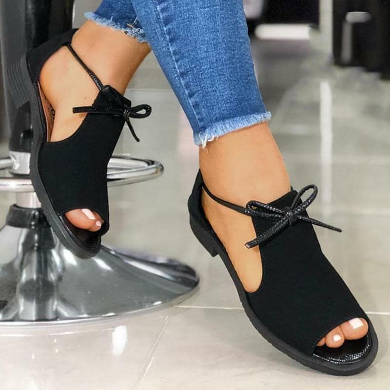 Women Casual Simple Pu Pure Color Bowknot Lace-up Flat Sandals