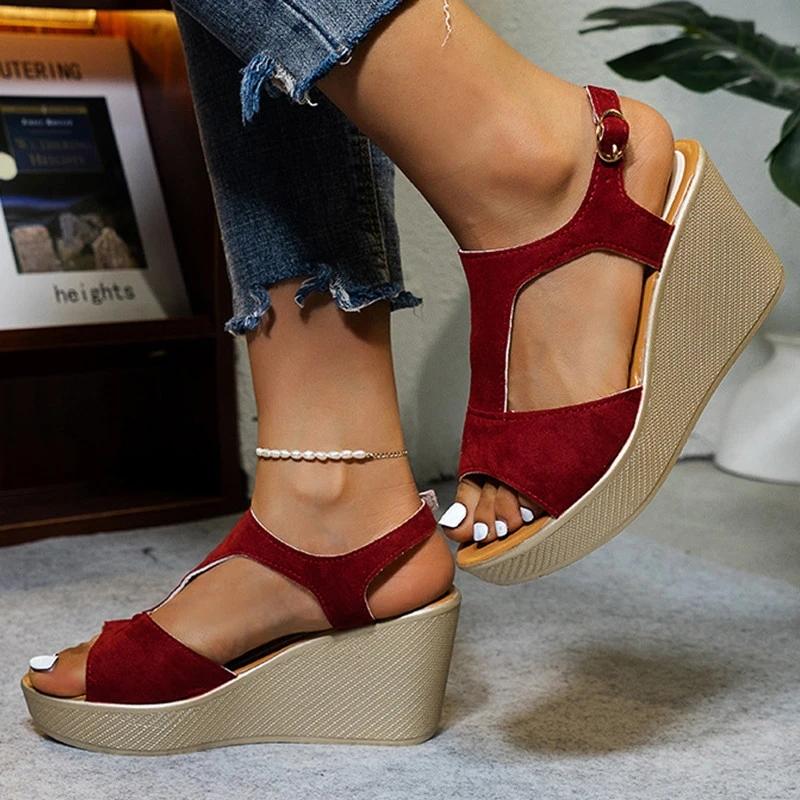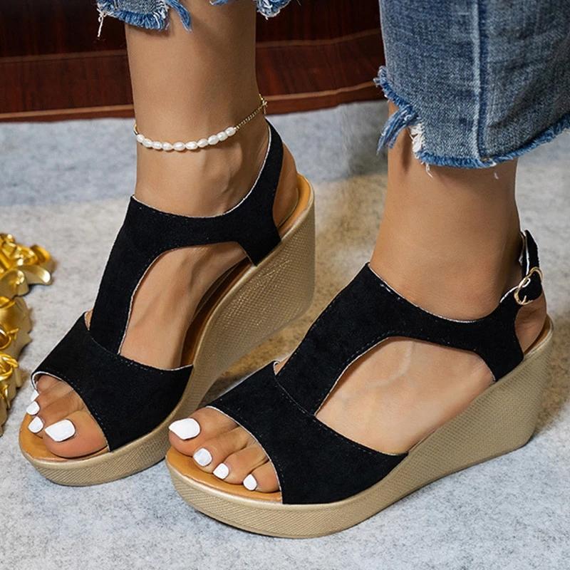 Women Casual Simple Shearling Hollow-out Adjusting Buckle Wedge Heel Sandals